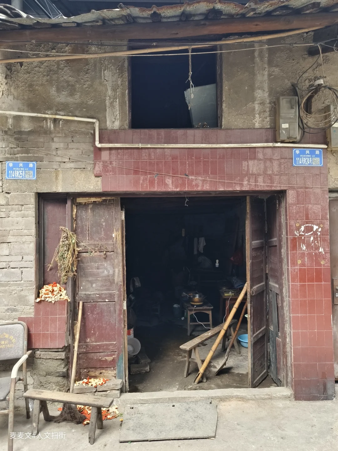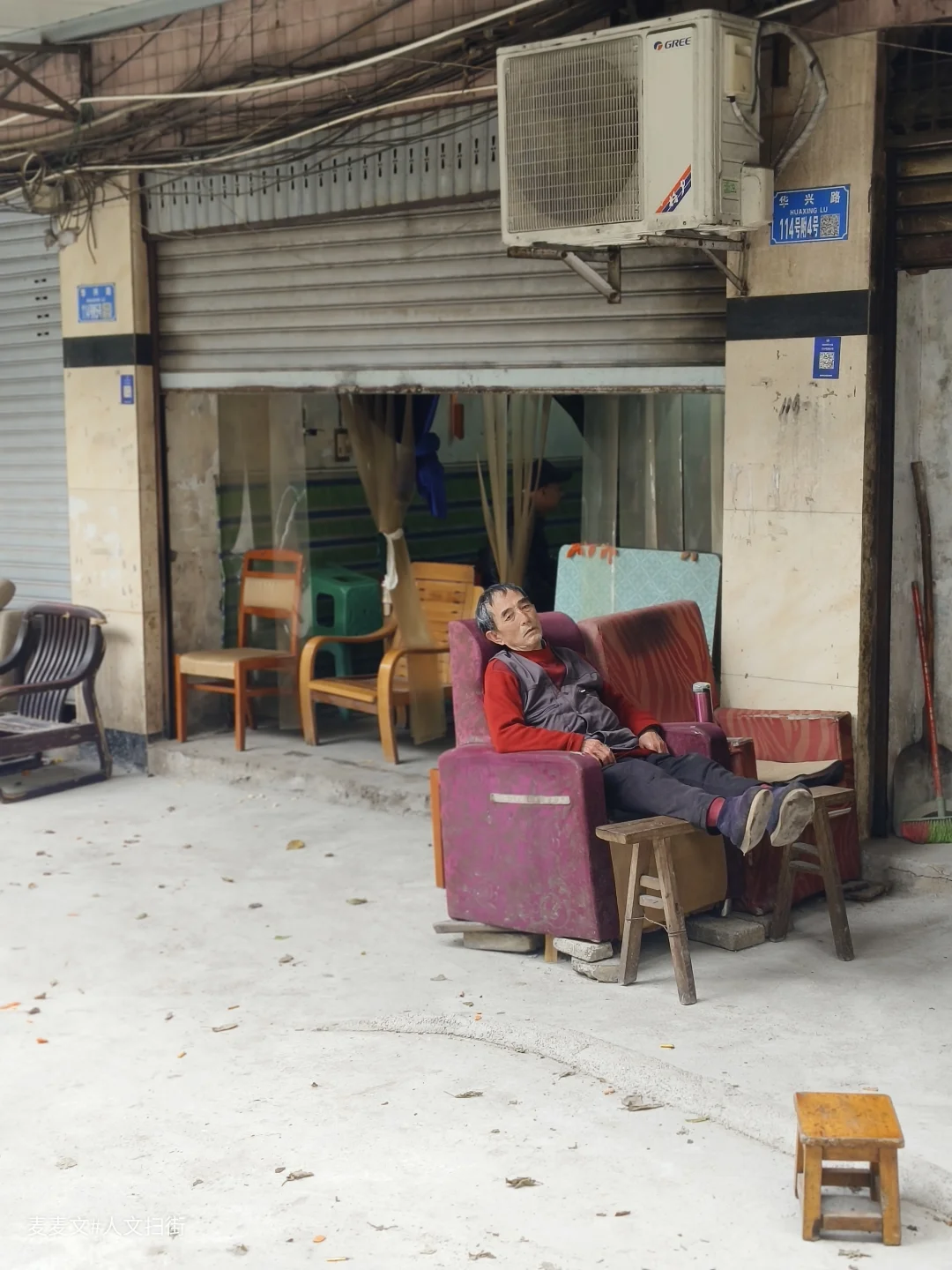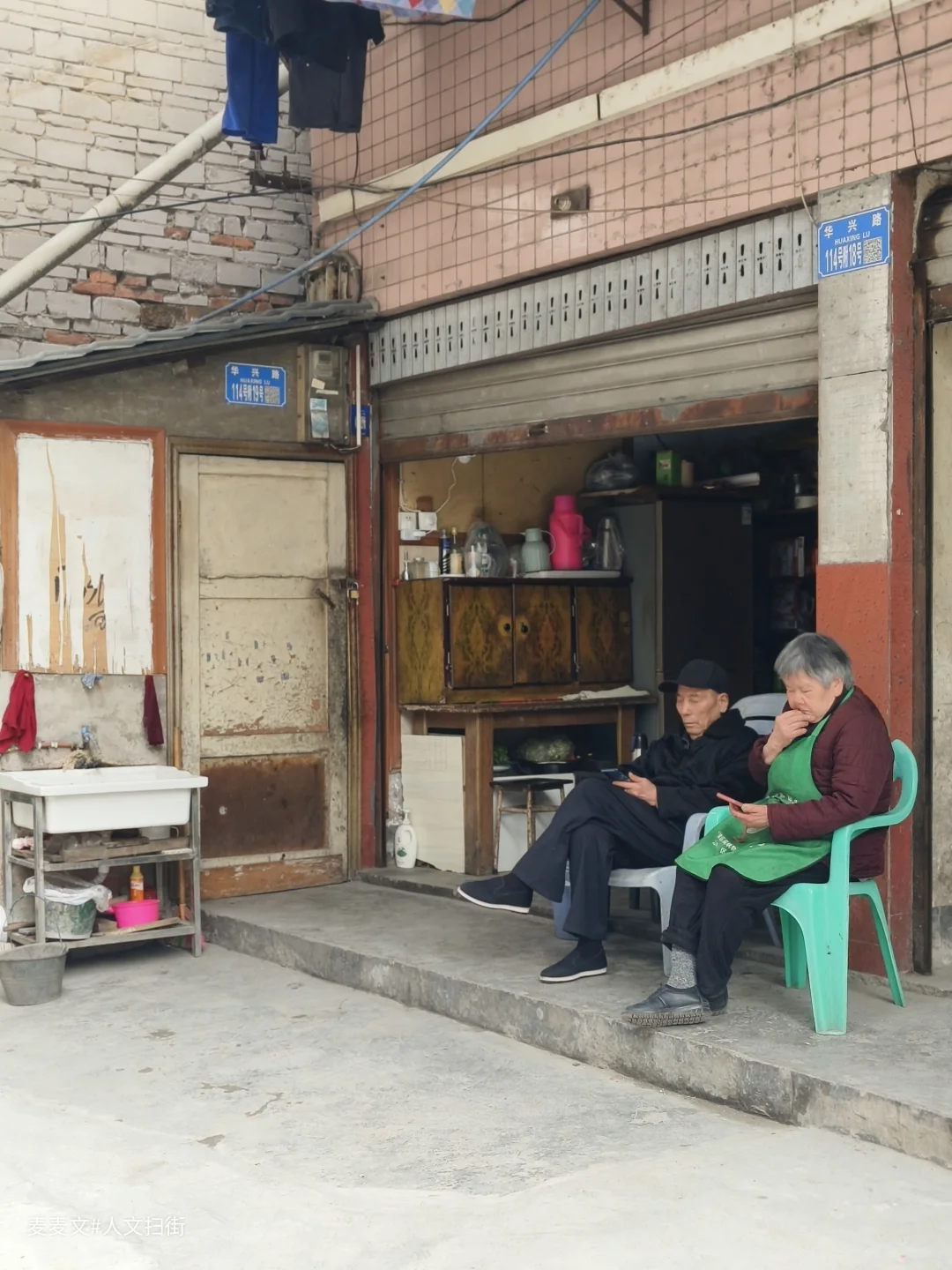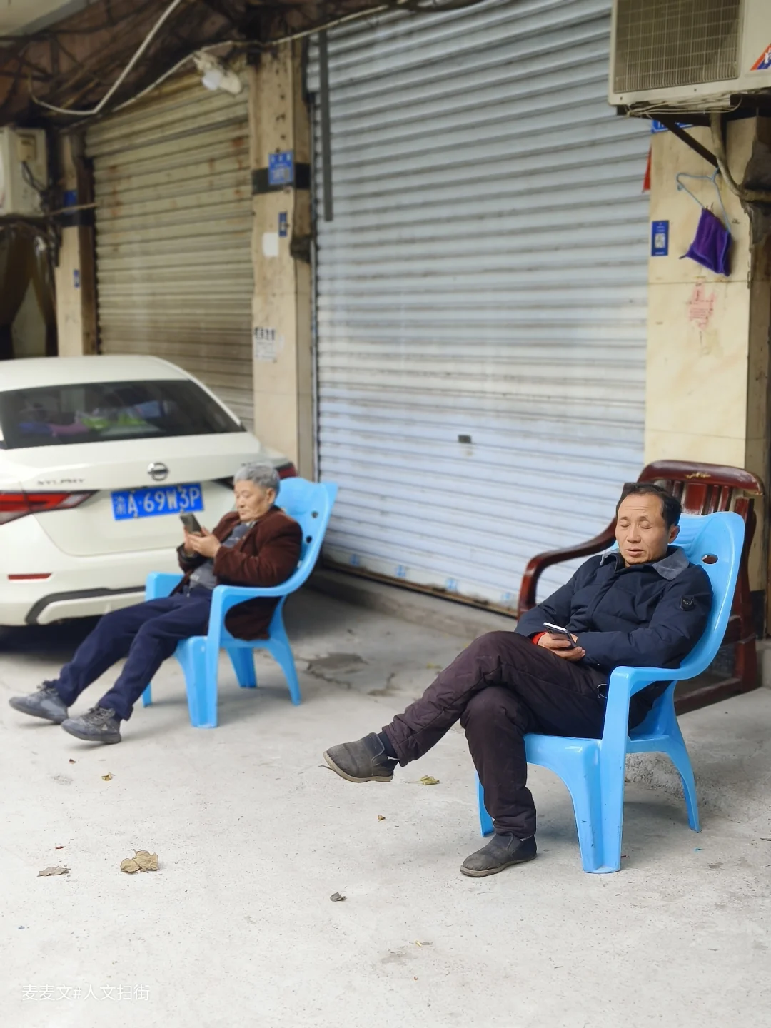华兴路上,老旧卷帘门、蓝白路牌、街边绿植相映,老人坐在门口晒阳、刷手机,新旧时光在此交融,电线在头顶织成网状,将阳光筛成细碎光斑,满是慵懒的老街氛围。