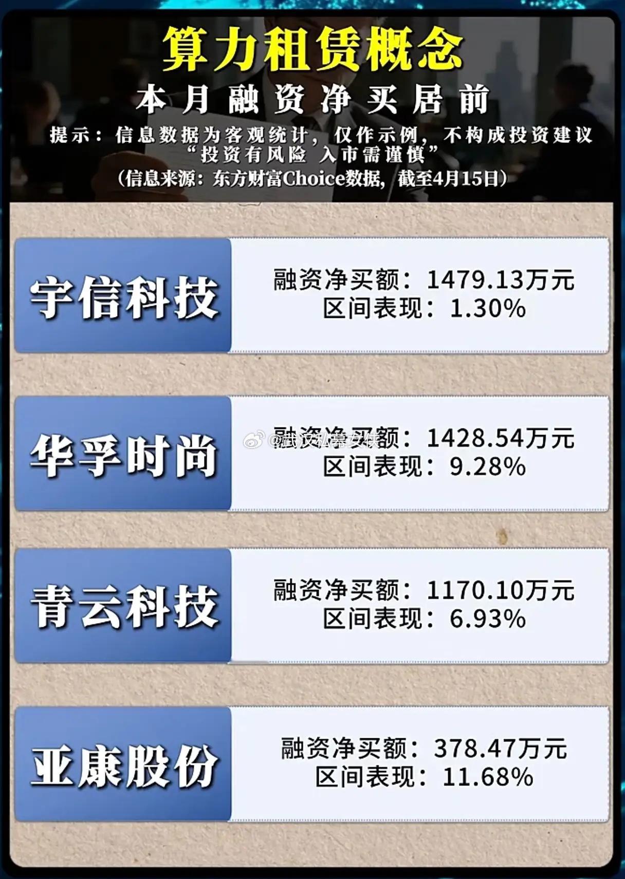 算力租赁火出圈!融资资金狂买这些股,谁才是AI算力的真龙头?AI大模型迭代、AI漫剧、AI教育等新应用爆发,算力需求正以指数级速度狂奔,算力租赁赛道彻底站在了资本市场的风口。截至4月15日的东方财富Choice数据显示,本月算力租赁概念融资净买榜中,资金用真金白银投出了最看好的标的,东方国信以2.6亿元融资净买额、17.03%的区间涨幅领跑榜单,大位科技、美利云、鸿博股份等紧随其后,亚康股份更是以11.68%的区间涨幅展现出强劲的爆发力,资金抢筹的热情肉眼可见。算力租赁的核心逻辑,早已不是简单的“租服务器”,而是AI时代的“算力水电”。最新行业动态显示,国内头部云厂商正加速推进“算力池化”技术,通过分布式调度实现算力的按需分配,让中小企业也能以低成本接入大模型训练能力;同时,液冷技术的规模化落地,让数据中心PUE值持续下探,算力租赁的运营效率和盈利空间大幅提升,这也是资金持续涌入赛道的核心底气。另一个关键信号是,国内AI大模型厂商正加速与算力租赁企业绑定,通过长期算力采购协议锁定资源,算力租赁企业的业绩确定性持续增强,行业进入“订单驱动”的增长新阶段。从榜单来看,东方国信的领跑绝非偶然。公司不仅深度布局算力租赁业务,更在工业大数据、AI大模型应用领域持续发力,形成了“算力+数据+应用”的完整闭环,融资资金的大幅涌入,正是市场对其全产业链布局的高度认可。美利云、鸿博股份作为算力租赁赛道的老牌玩家,凭借成熟的IDC资源和稳定的客户结构,持续获得资金青睐;而亚康股份、华孚时尚等标的的高区间涨幅,则凸显出市场对算力租赁细分赛道弹性标的的追捧。但我们必须清醒地看到,算力租赁赛道的竞争正在加剧,并非所有标的都能穿越周期。一方面,头部云厂商的算力服务对中小租赁企业形成挤压,只有具备差异化技术优势、优质客户资源的企业才能突围;另一方面,算力需求的爆发式增长也带来了算力供给的阶段性紧张,相关企业的业绩兑现能力将成为股价的核心支撑。对于投资者而言,算力租赁是AI时代的黄金赛道,但需警惕短期涨幅过高带来的回调风险,重点关注业绩确定性强、技术壁垒高的龙头标的。AI的下半场,算力就是生产力。算力租赁赛道的资金抢筹,本质上是市场对AI产业长期发展的坚定押注。在技术迭代和需求爆发的双重驱动下,算力租赁行业将迎来持续的高增长,而那些真正掌握核心算力资源、具备技术创新能力的企业,必将成为AI时代的最大赢家。