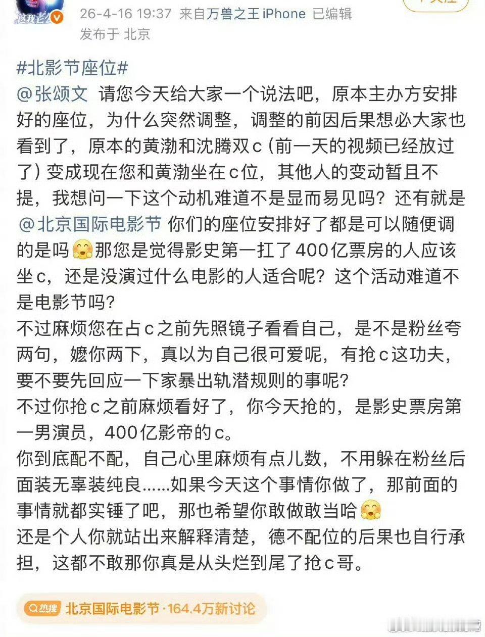 沈腾大粉喊话张颂文沈腾大粉喊话张颂文回应家暴出轨 看座次本来是沈腾和黄渤双C位,