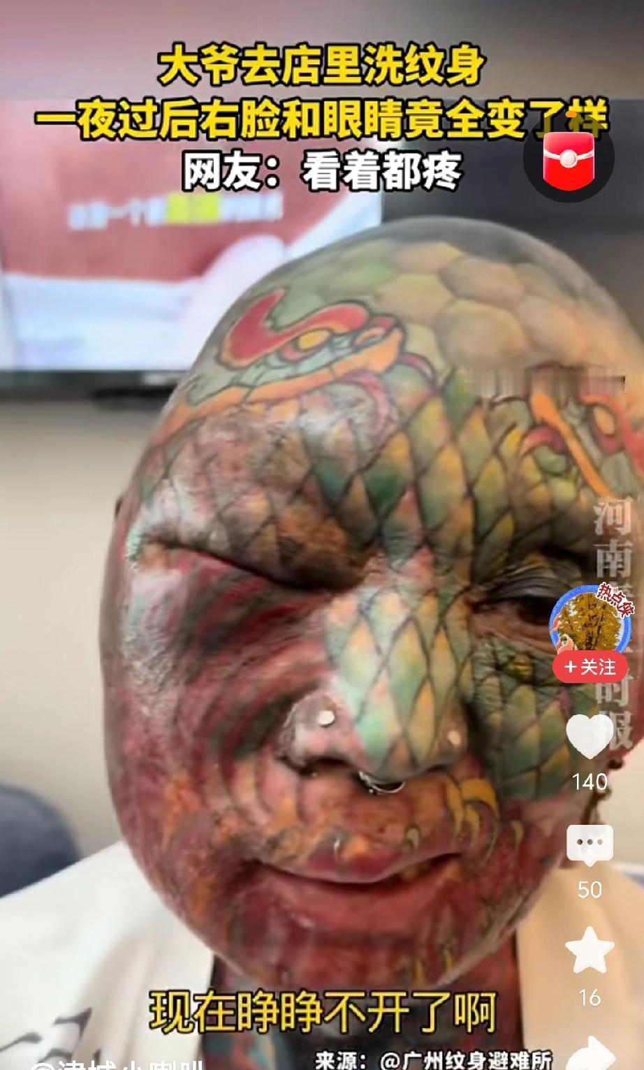 有网友说,大爷活到了这个岁数,终于把青春期的叛逆阶段过完了,这满脸的纹身现在要洗掉了,我觉得网友很有才,总结的很到位啊! 但是我感觉都这把岁数了,还遭这罪干嘛,洗纹身比纹起来还要疼,而且最终应该也洗不干净,确实有点没必要吧!