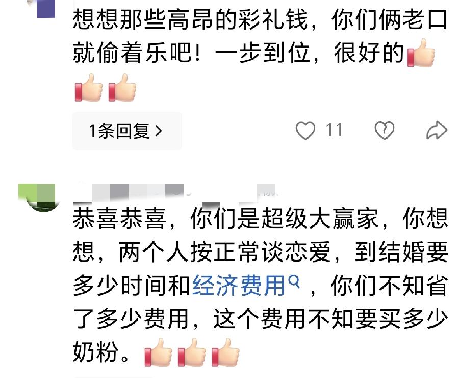 还有网友称:你们才是大赢家,你想想,两个人按正常谈恋爱,到结婚要多少时间和经济费用,你们不知省了多少费用,这个费用不知要买多少奶粉。