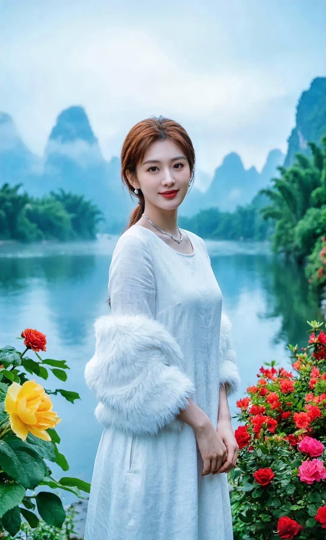 白裙似雪,晕染山水的韵。 毛袖轻笼,裹住春日的温。 她立在花畔,笑意融着水柔