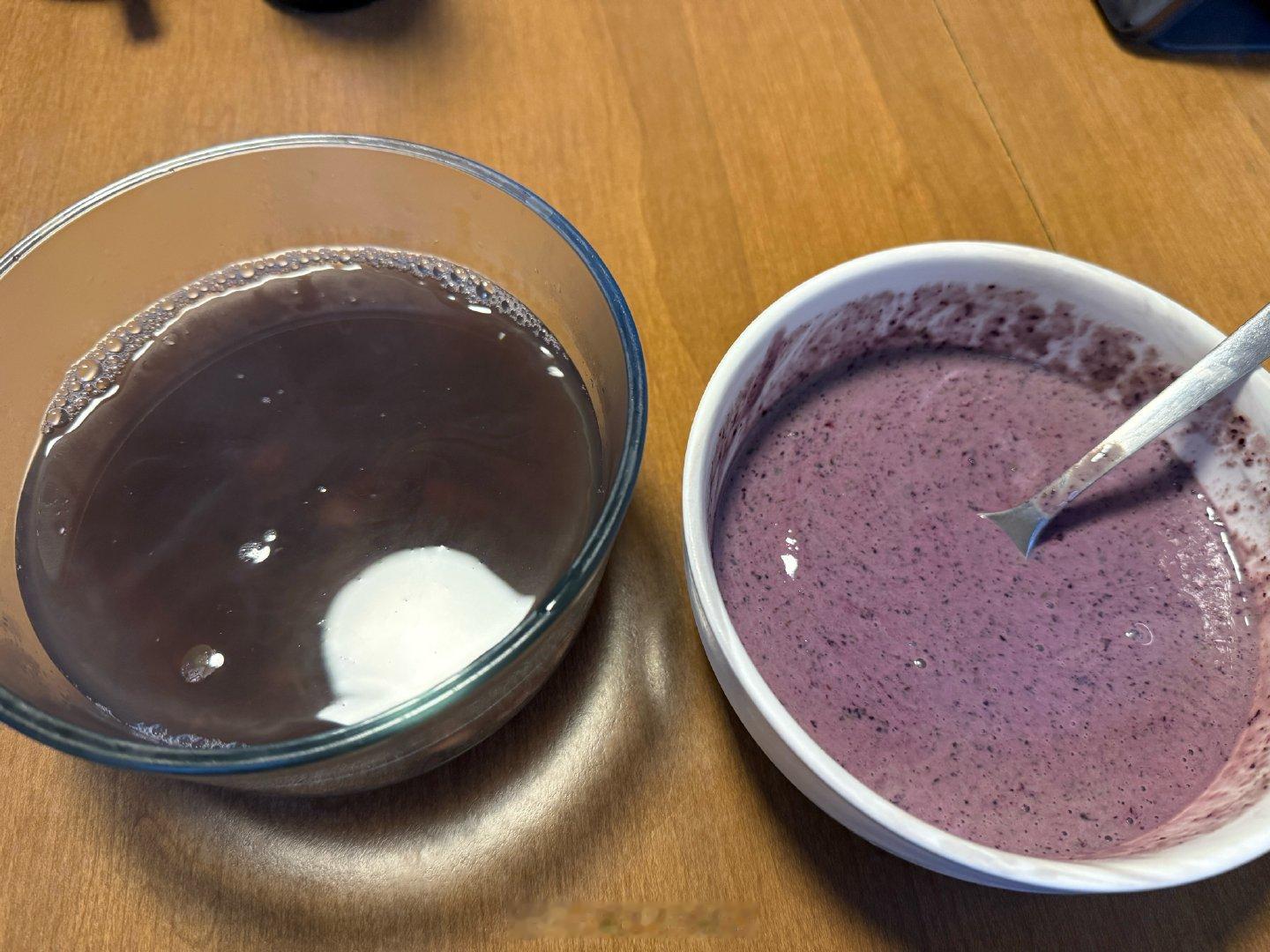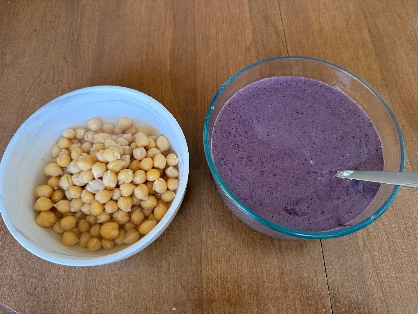 一杯奶昔(脱脂酸奶、蛋白粉、羽衣甘蓝、蓝莓、芝麻菜、甜菜根、杏仁奶)加一碗豆子。
