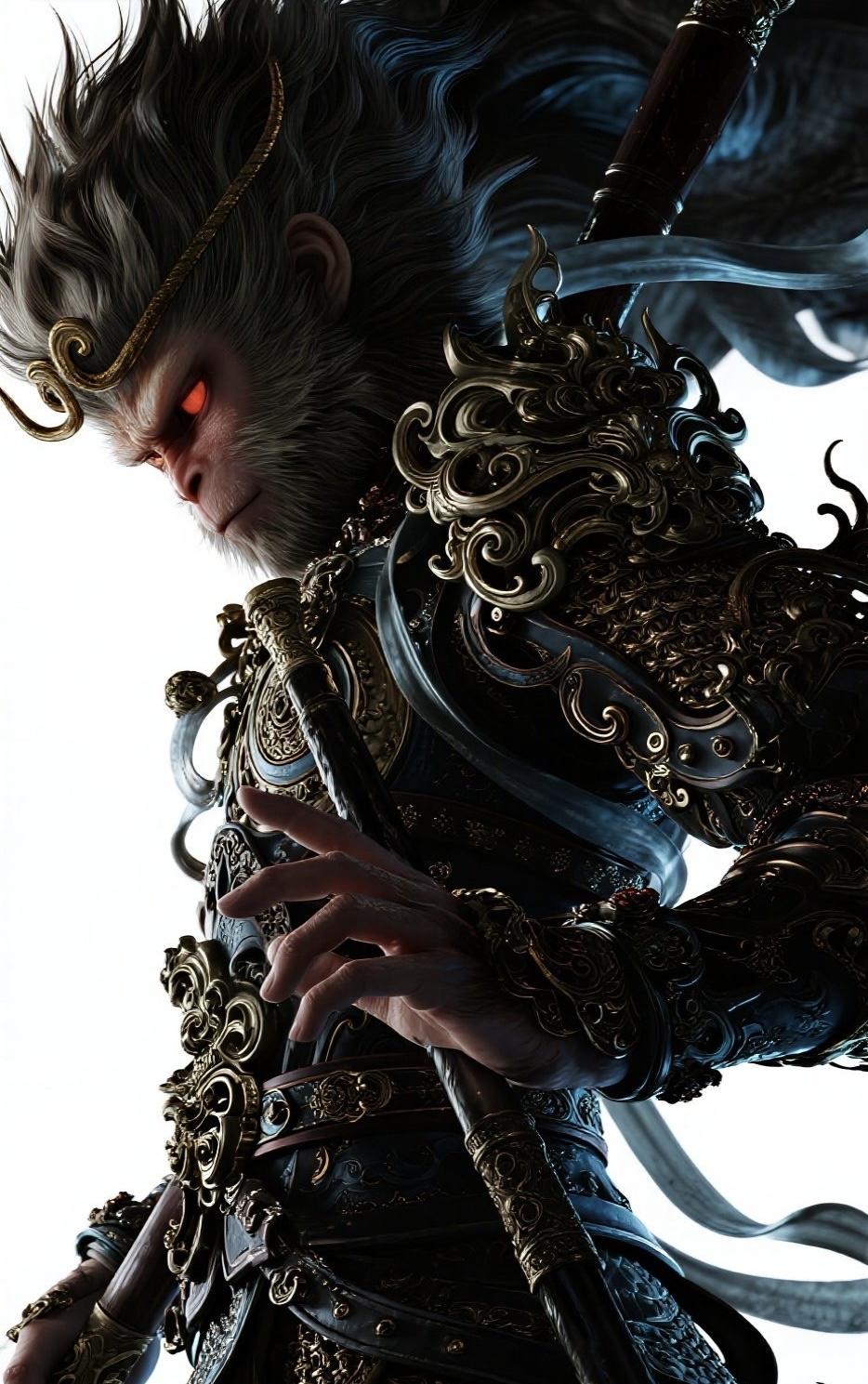 📝全景仰视视角下,悟空仅露头部与手部,立体精致,轮廓分明。巨大的如意金箍棒层层叠叠、构造繁复,布满华丽炫酷的纹路,冷硬质感十足。