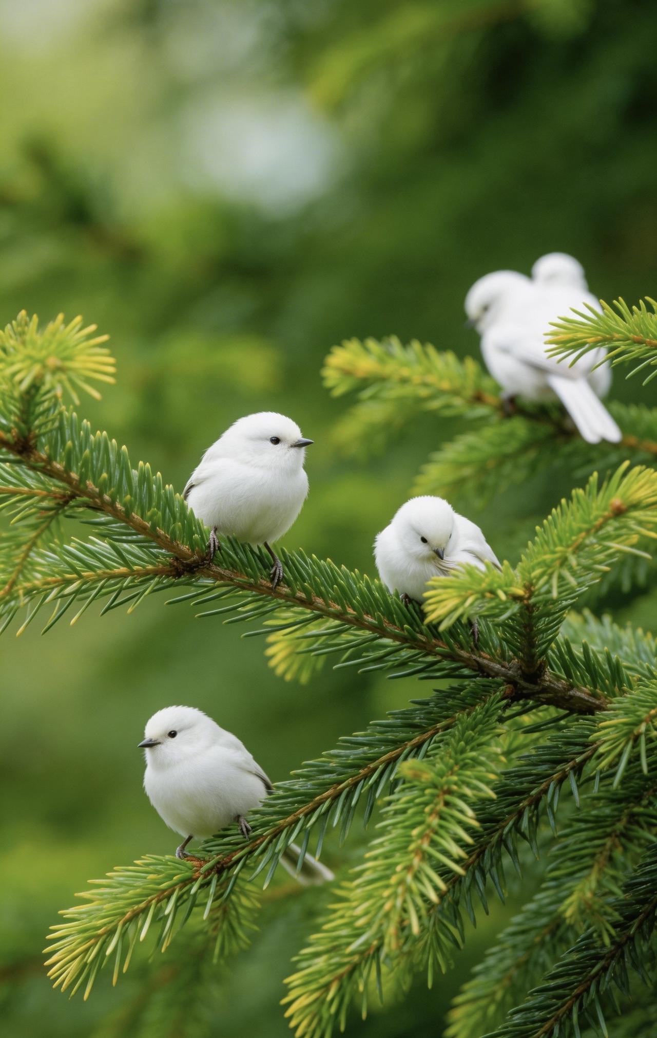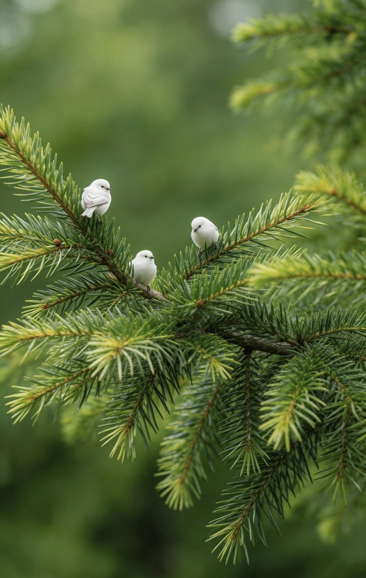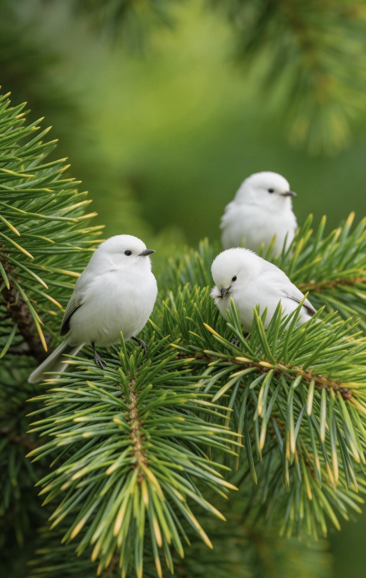 📝瞧这枝头上,停着几只白雀儿,像几朵落下的云。它们小小的身子,雪白的羽毛衬着那深绿的针状叶,格外显眼。