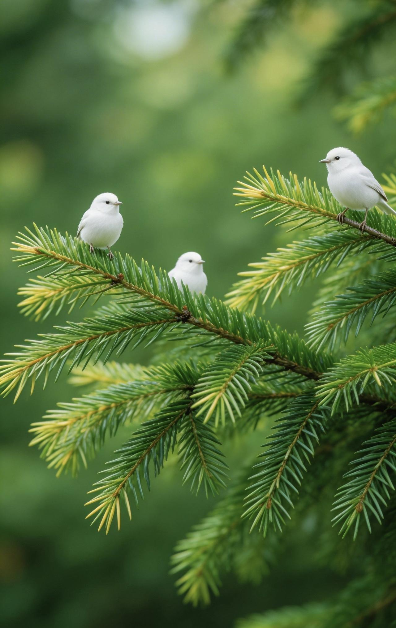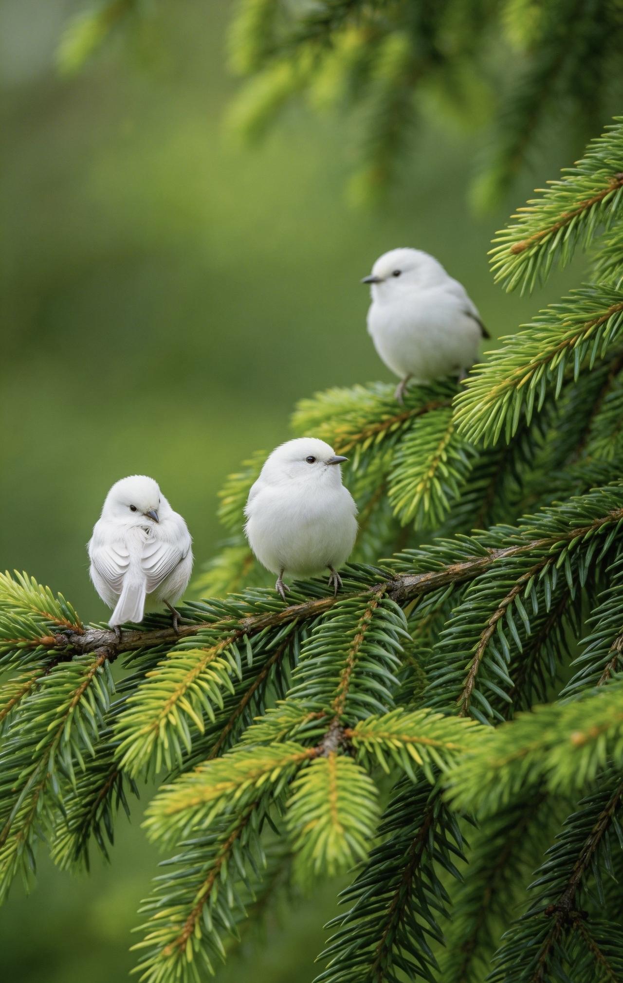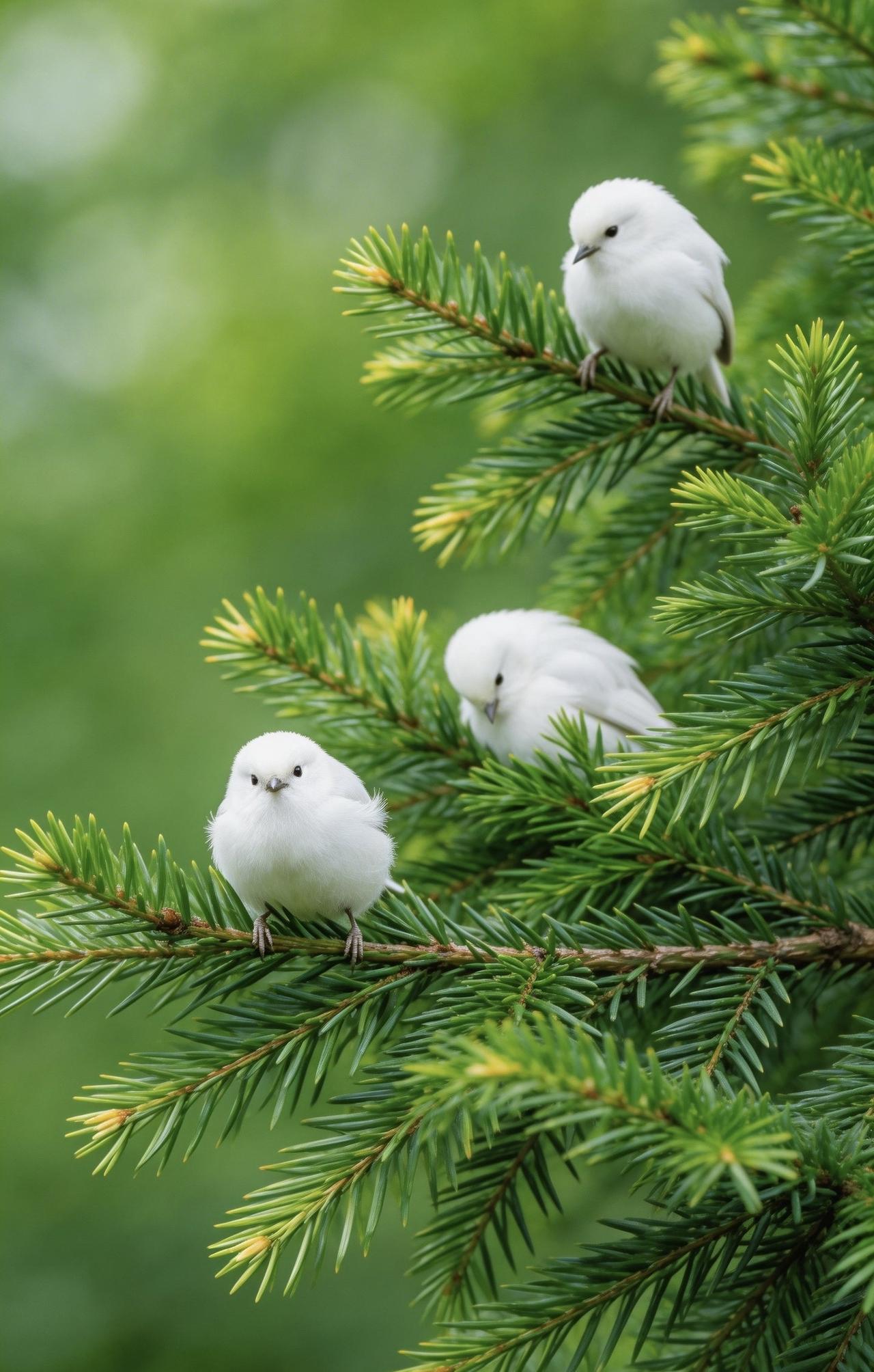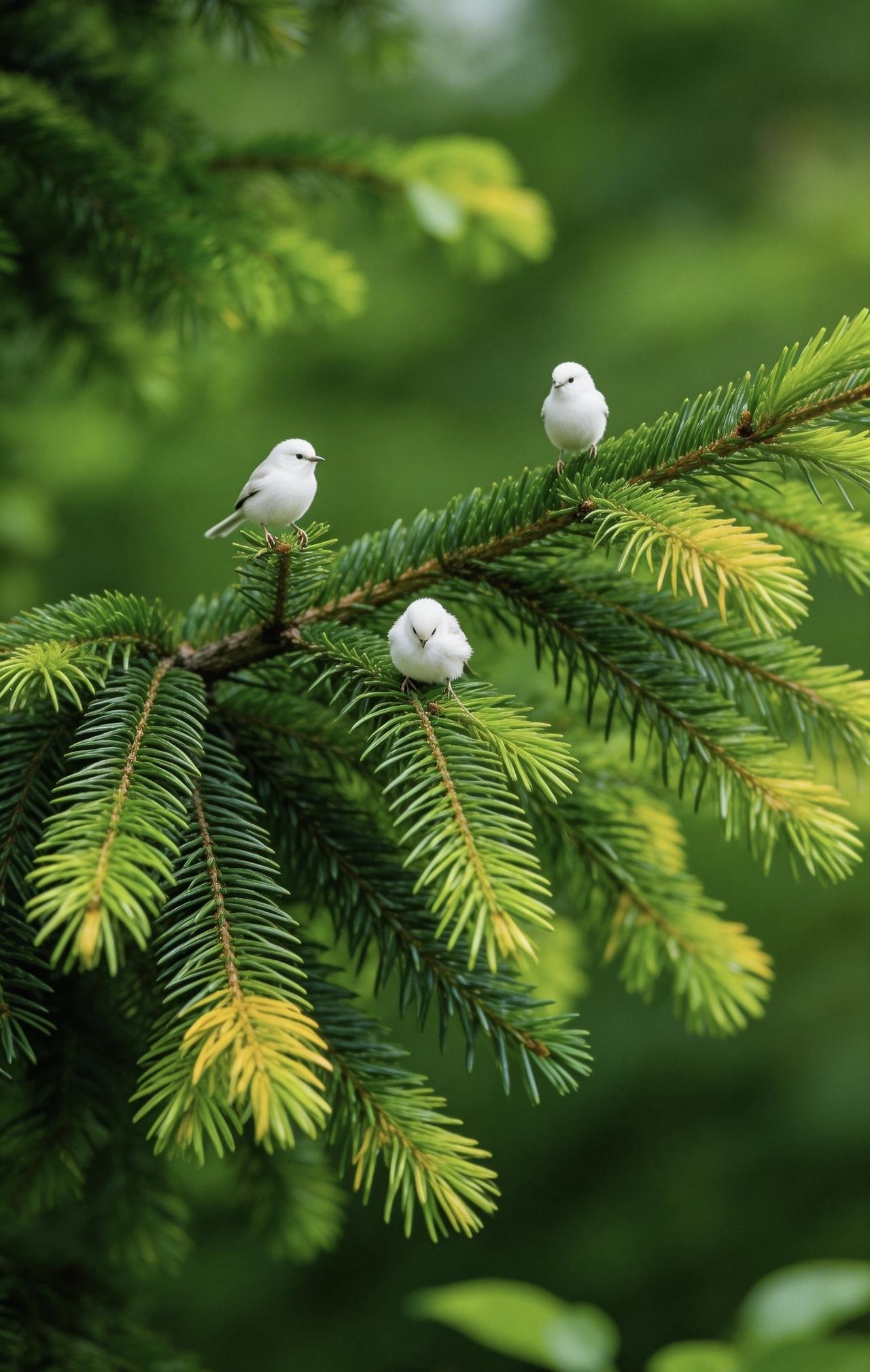 📝瞧这枝头上,停着几只白雀儿,像几朵落下的云。它们小小的身子,雪白的羽毛衬着那深绿的针状叶,格外显眼。