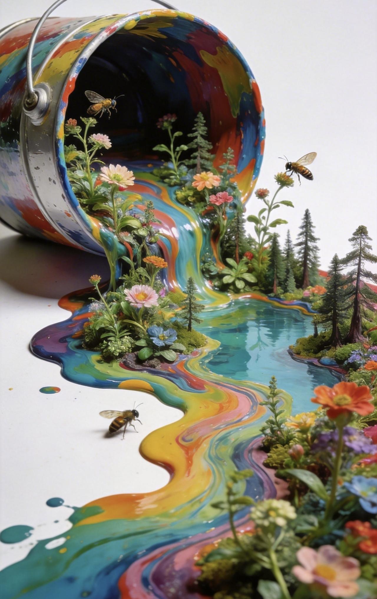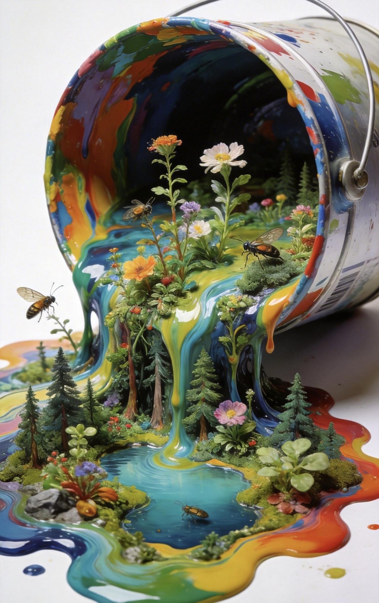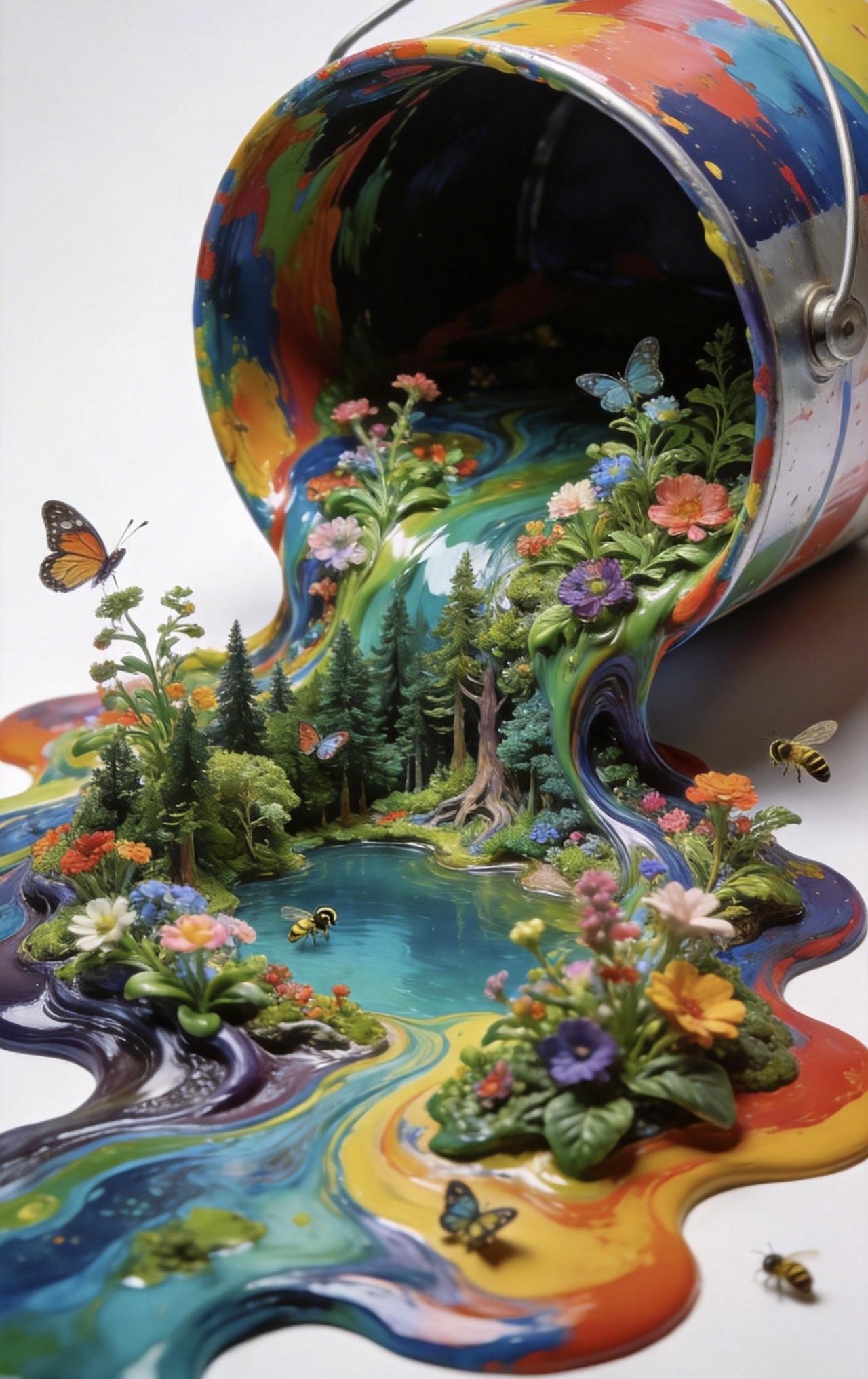 📝纯色背景前,一只打翻的彩色油漆桶肆意流淌,颜料化作蜿蜒森林与澄澈湖泊,形成自然流动的流体画作。浓艳色块层层交融,既保留颜料的液态质感,又在其上生出繁茂植物,枝蔓舒展、繁花盛放。