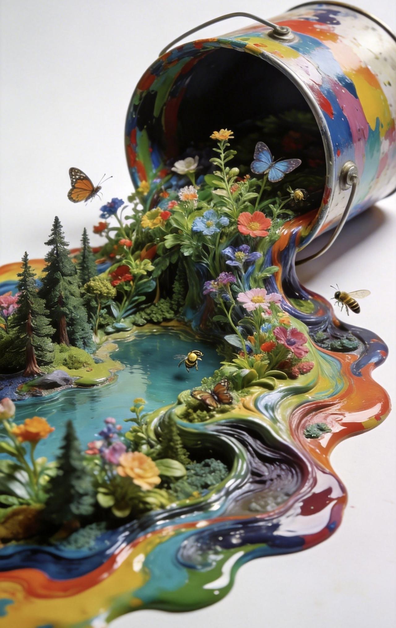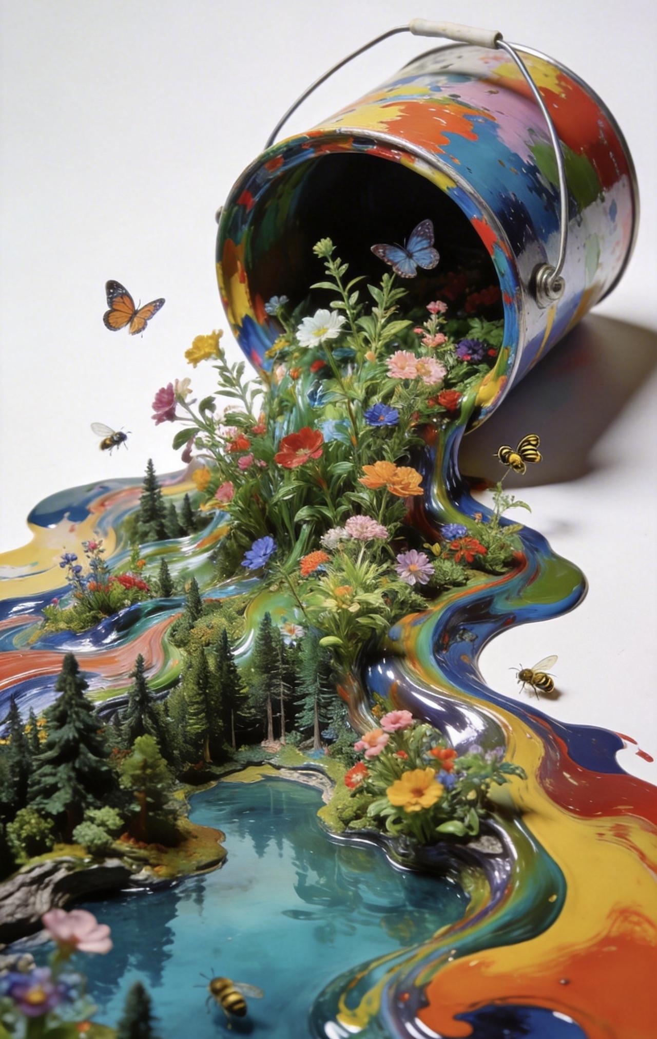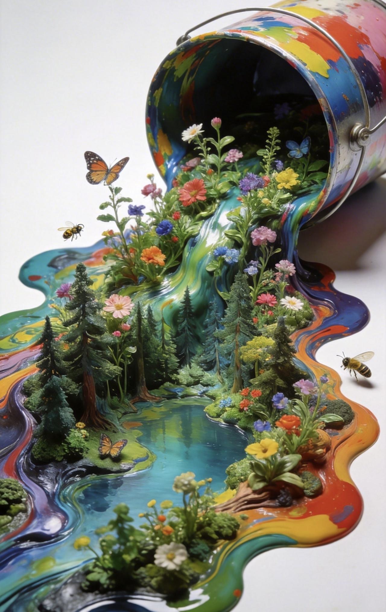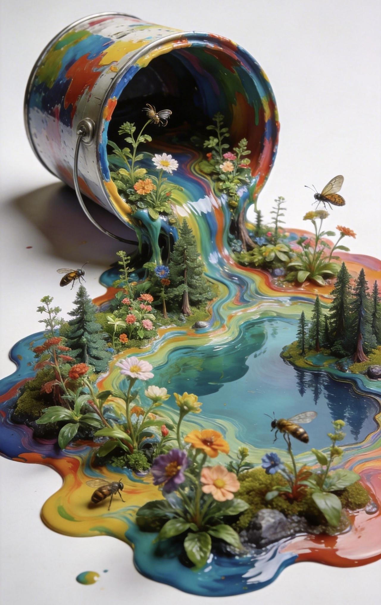 📝纯色背景前,一只打翻的彩色油漆桶肆意流淌,颜料化作蜿蜒森林与澄澈湖泊,形成自然流动的流体画作。浓艳色块层层交融,既保留颜料的液态质感,又在其上生出繁茂植物,枝蔓舒展、繁花盛放。