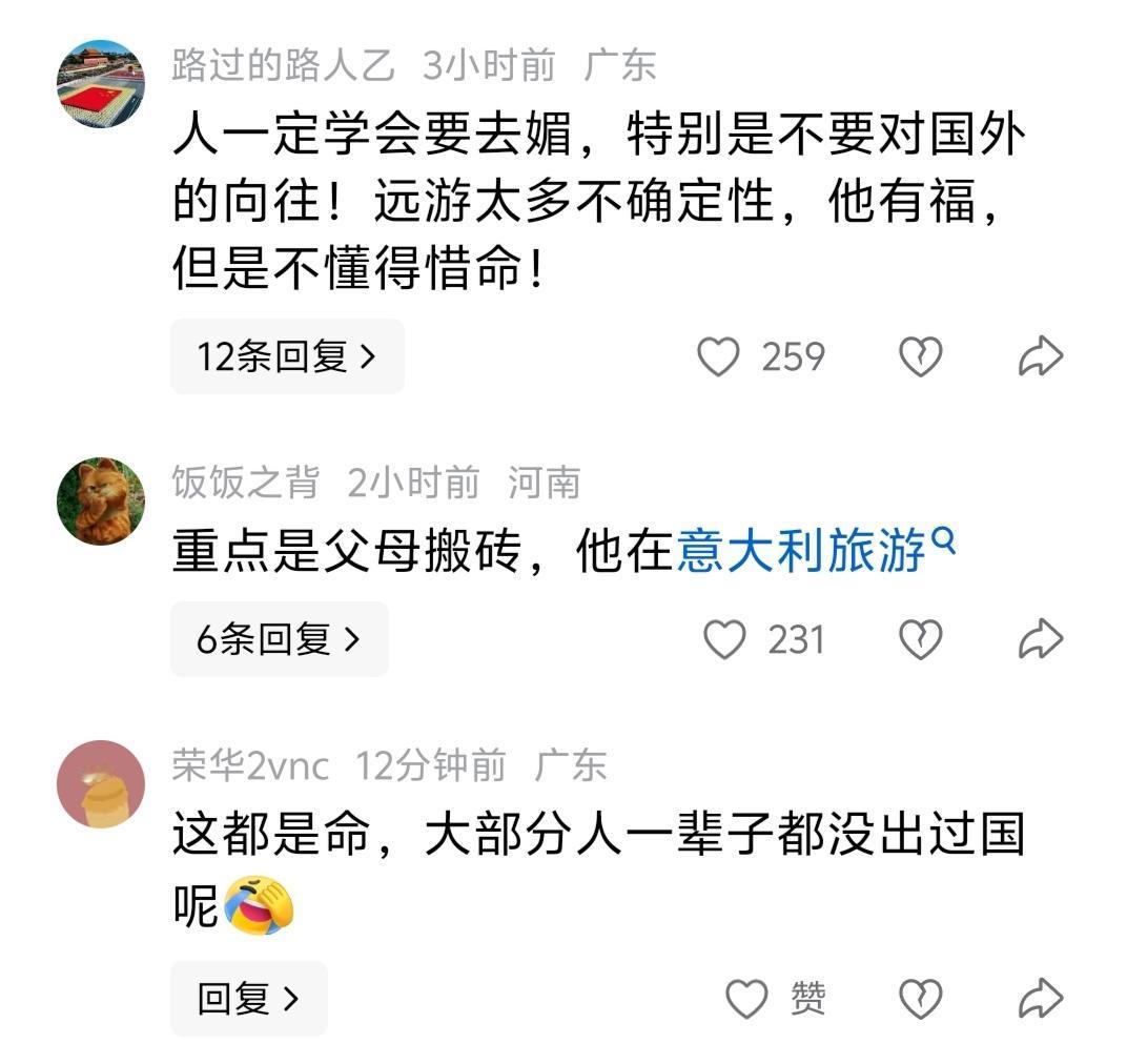 网友热评:重点是父母搬砖,他在意大利旅游!