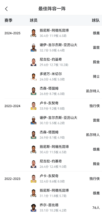 东部第一,联盟3支60胜球队之一。场均24+5+10(差0.1我直接说整数了)一阵稳进的就4人,(文班亚马,约基奇,亚历山大,坎宁安)最后一个不是布朗就是卢卡。个人觉得卢卡概率会高一丢丢。最后就是看图吧 去年的一阵
