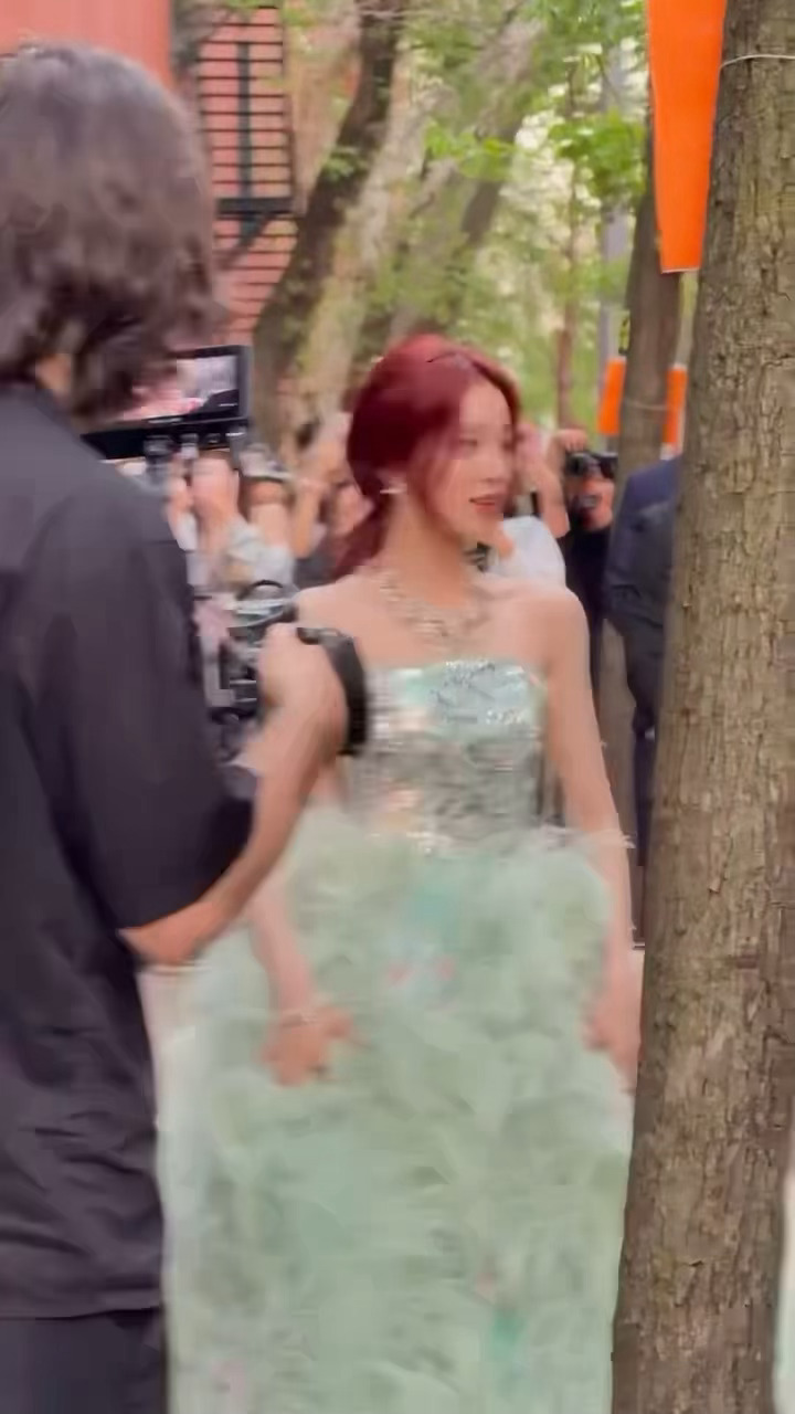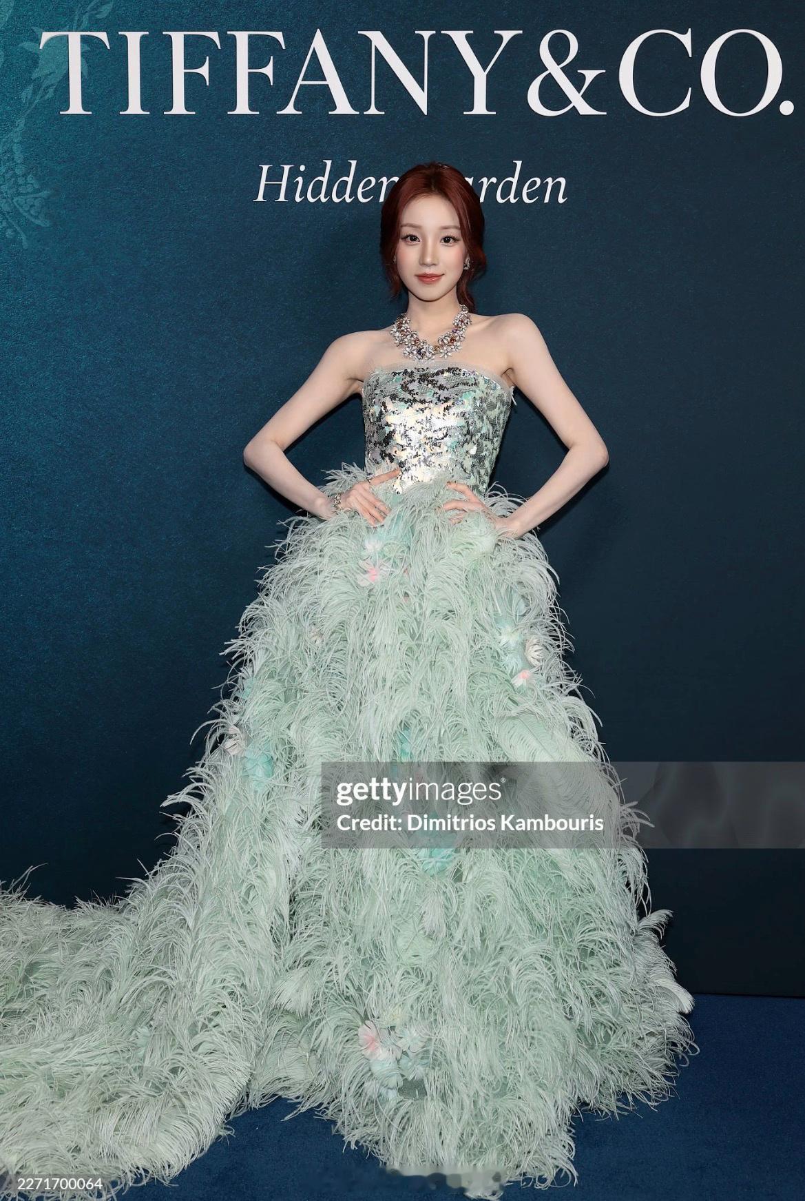 宋雨琦纽约线下活动状态宋雨琦薄荷绿抹胸羽毛裙造型