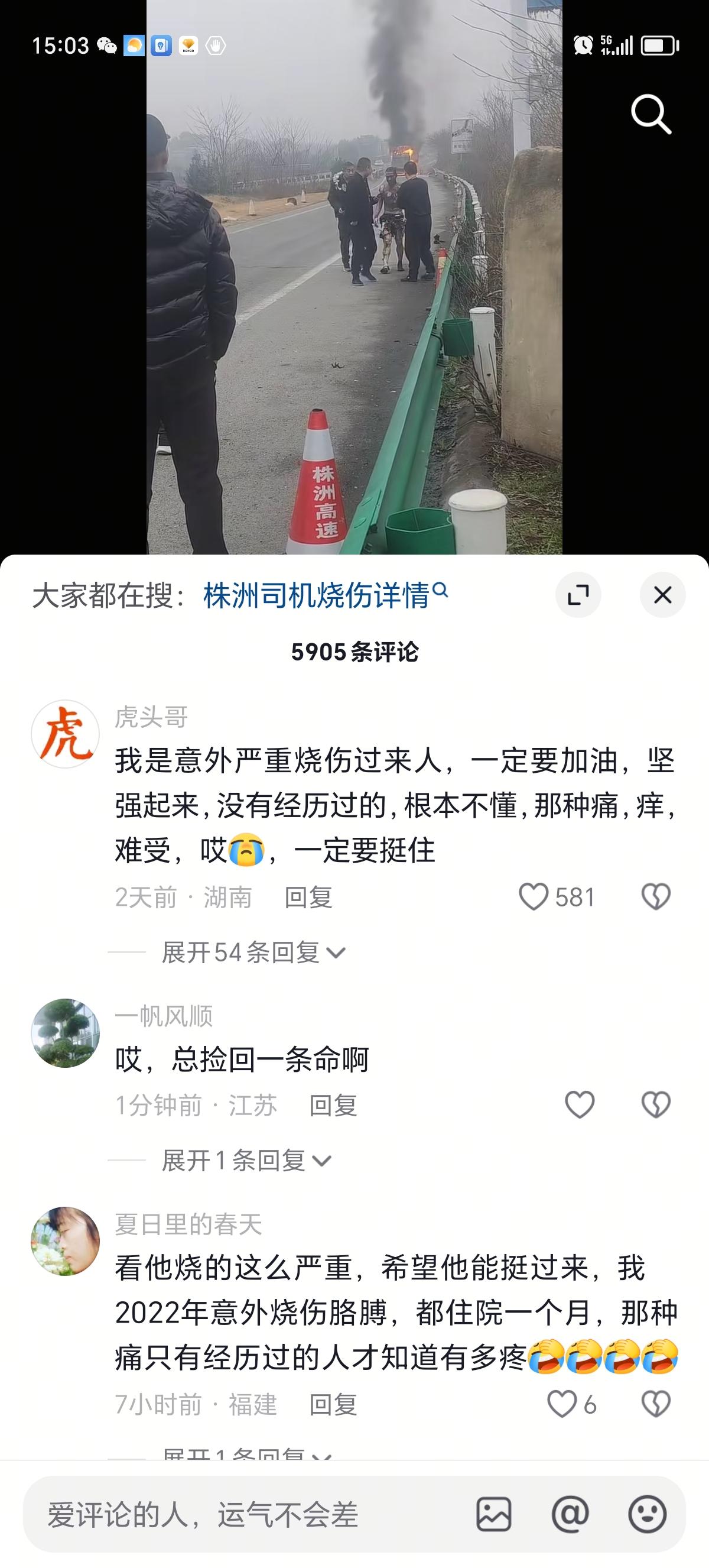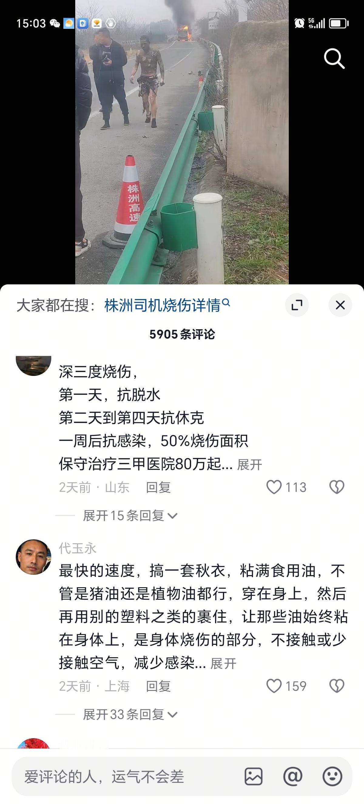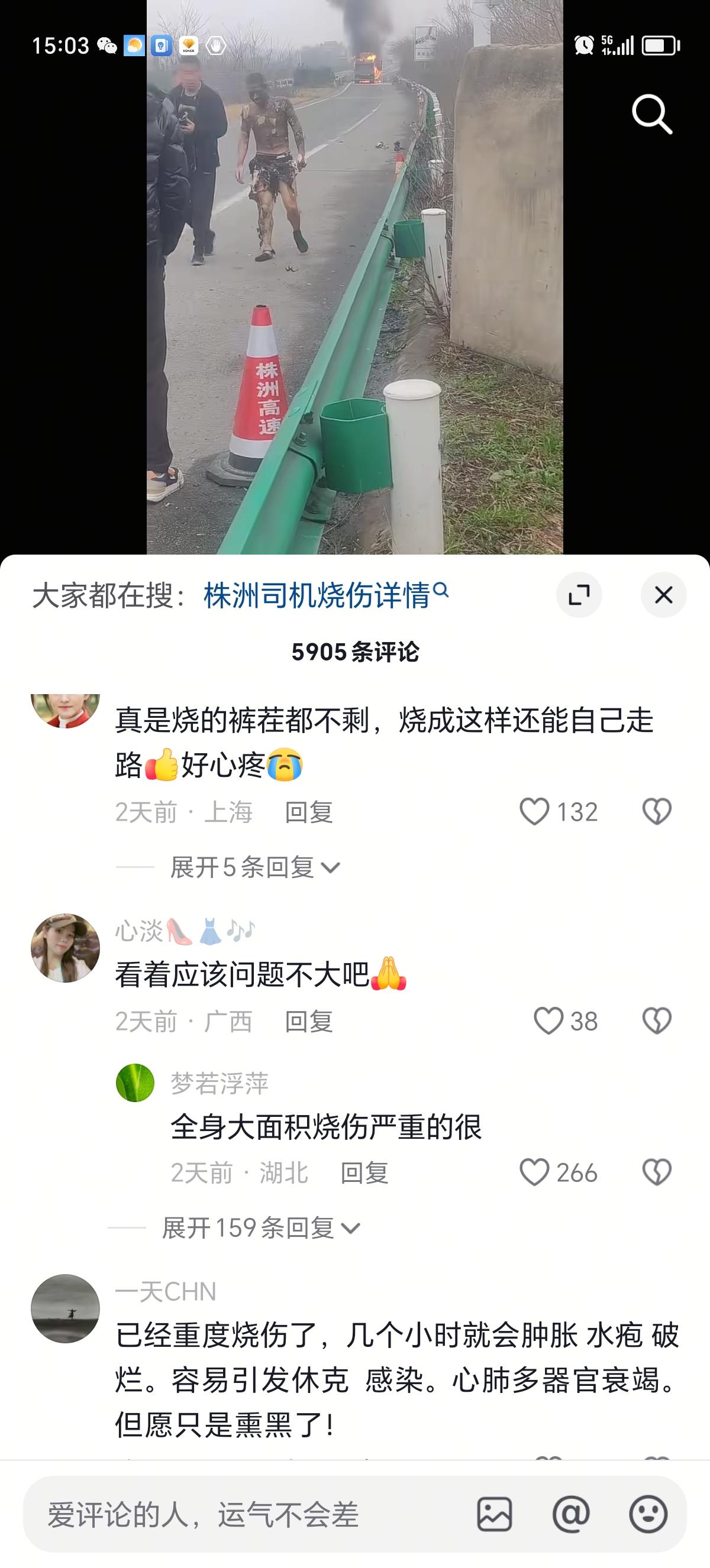我的天,汽车途中起火,师傅烧的体无完肤还能走路,万幸捡回一条命,希望能够马上救医脱离危险,一定要加油!