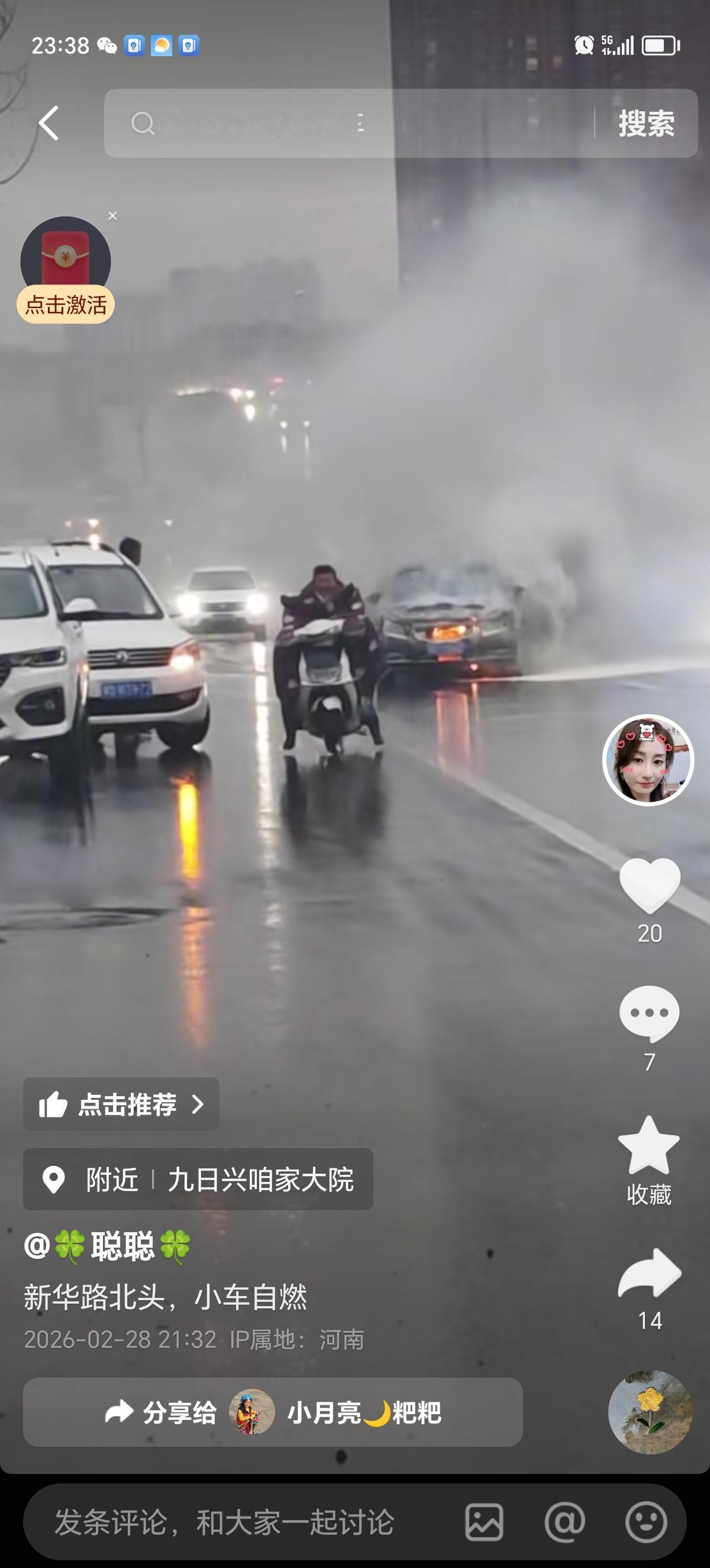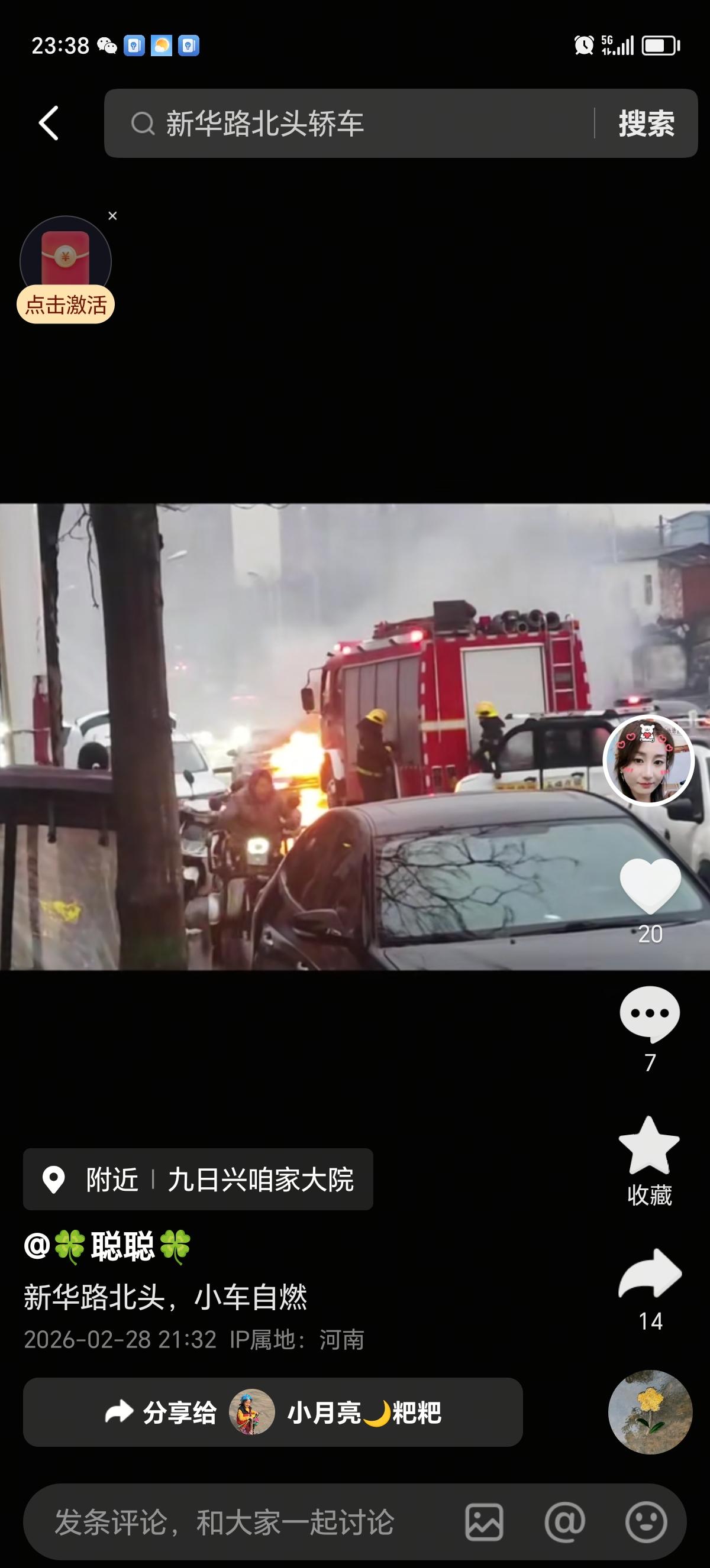 2月28 日,细雨蒙蒙,河南省某市新华路北头小车不明原因发生自燃现象,消防员扑救