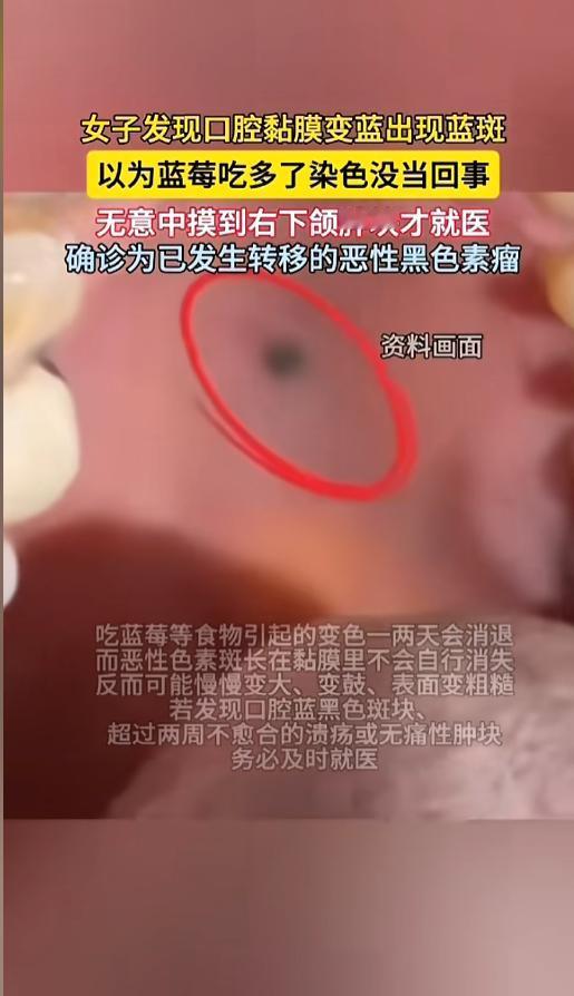 信息来源:《女子以为蓝莓吃多了嘴变蓝 摸到硬疙瘩就诊一查竟是癌(陕视新闻》半岛晨报