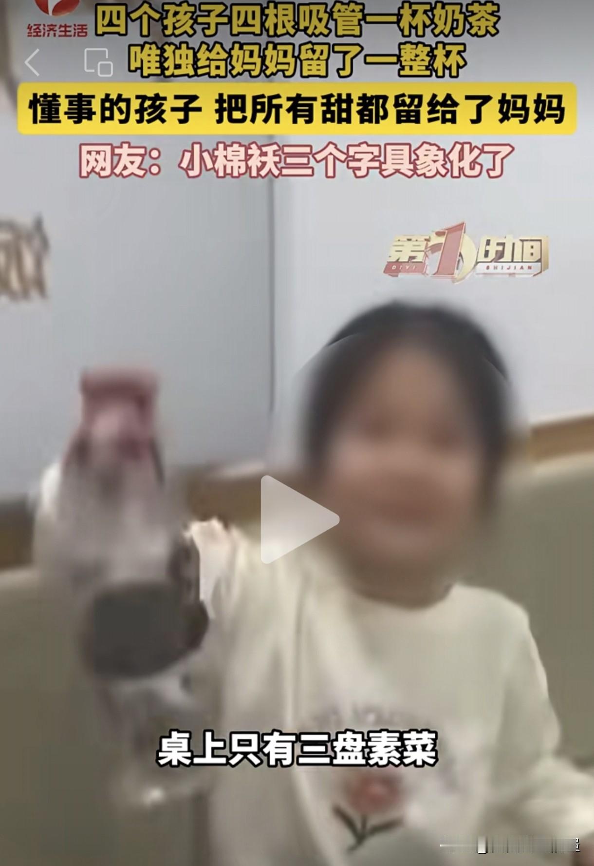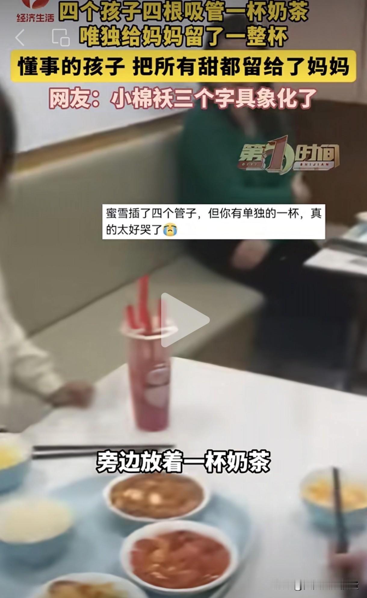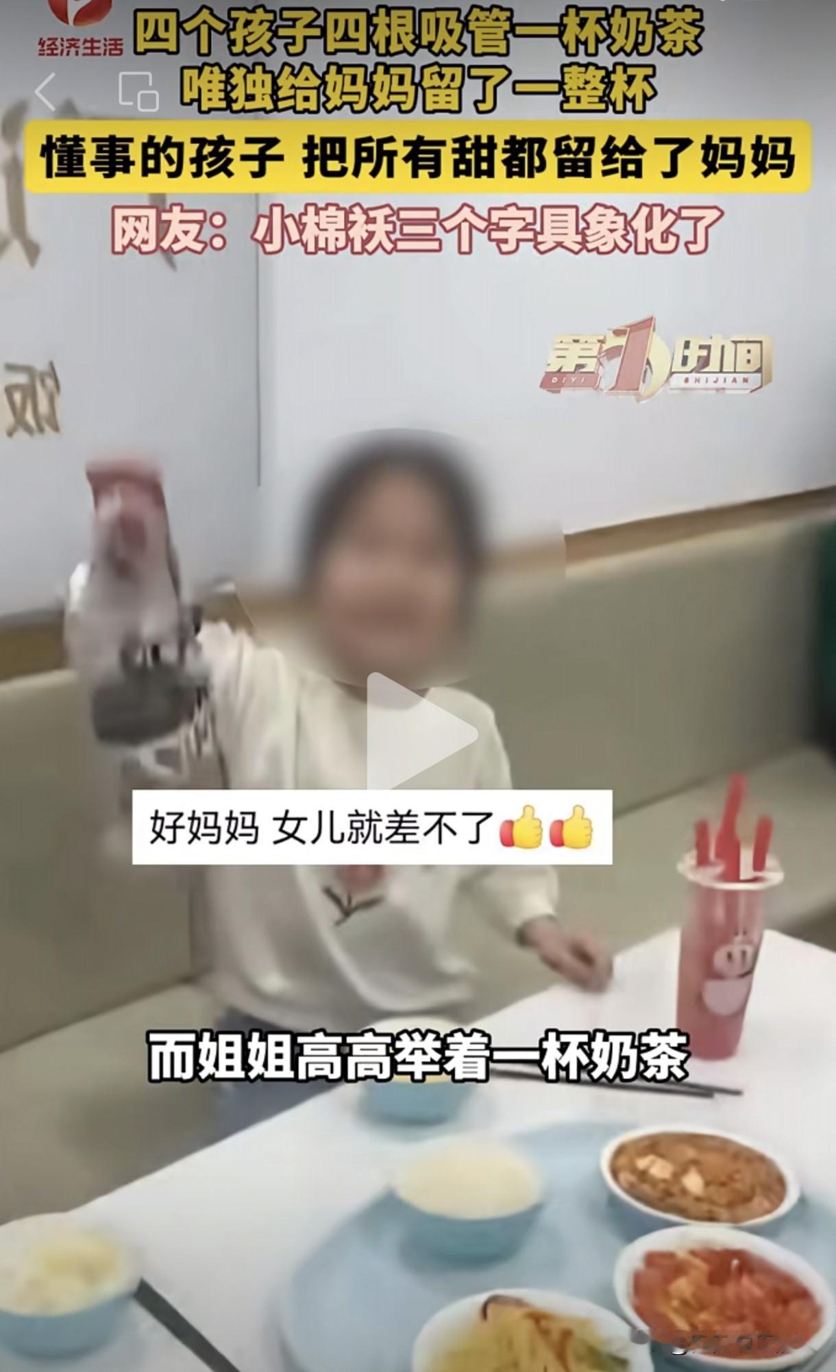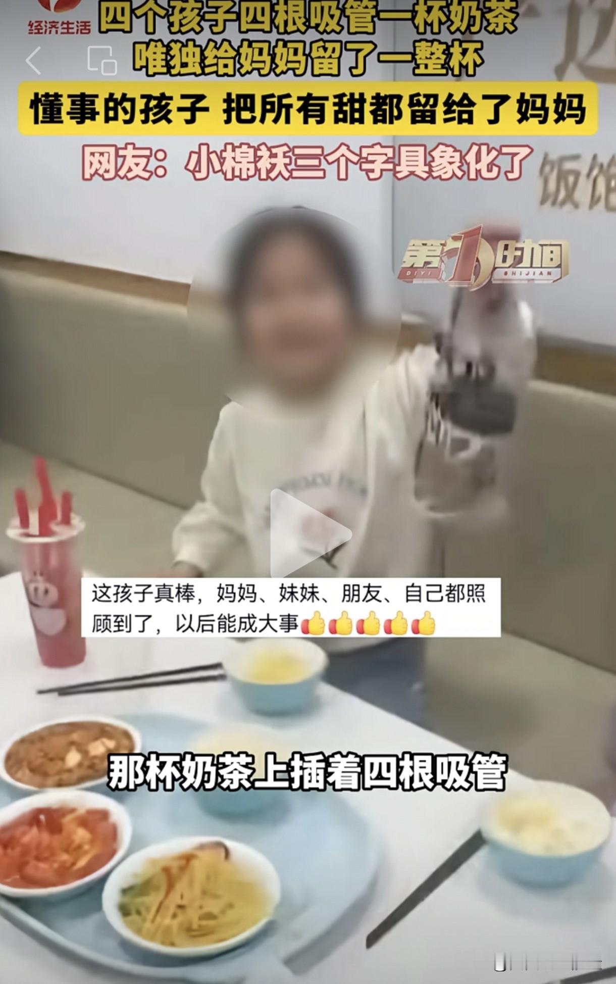 懂事的孩子让人又疼又爱,这位妈妈喝到了世上最甜的奶茶。姐姐要带妹妹一起去跟小伙伴聚餐,要上班的妈妈给了50元经费。爸爸去餐厅接人时发现,她们四个孩子只买了四个素菜,一杯奶茶,奶茶上面插了四根吸管,显然是四个孩子共享一杯奶茶。随后姐姐又面对镜头举起另外一杯完整无缺的奶茶,说是买给妈妈的。