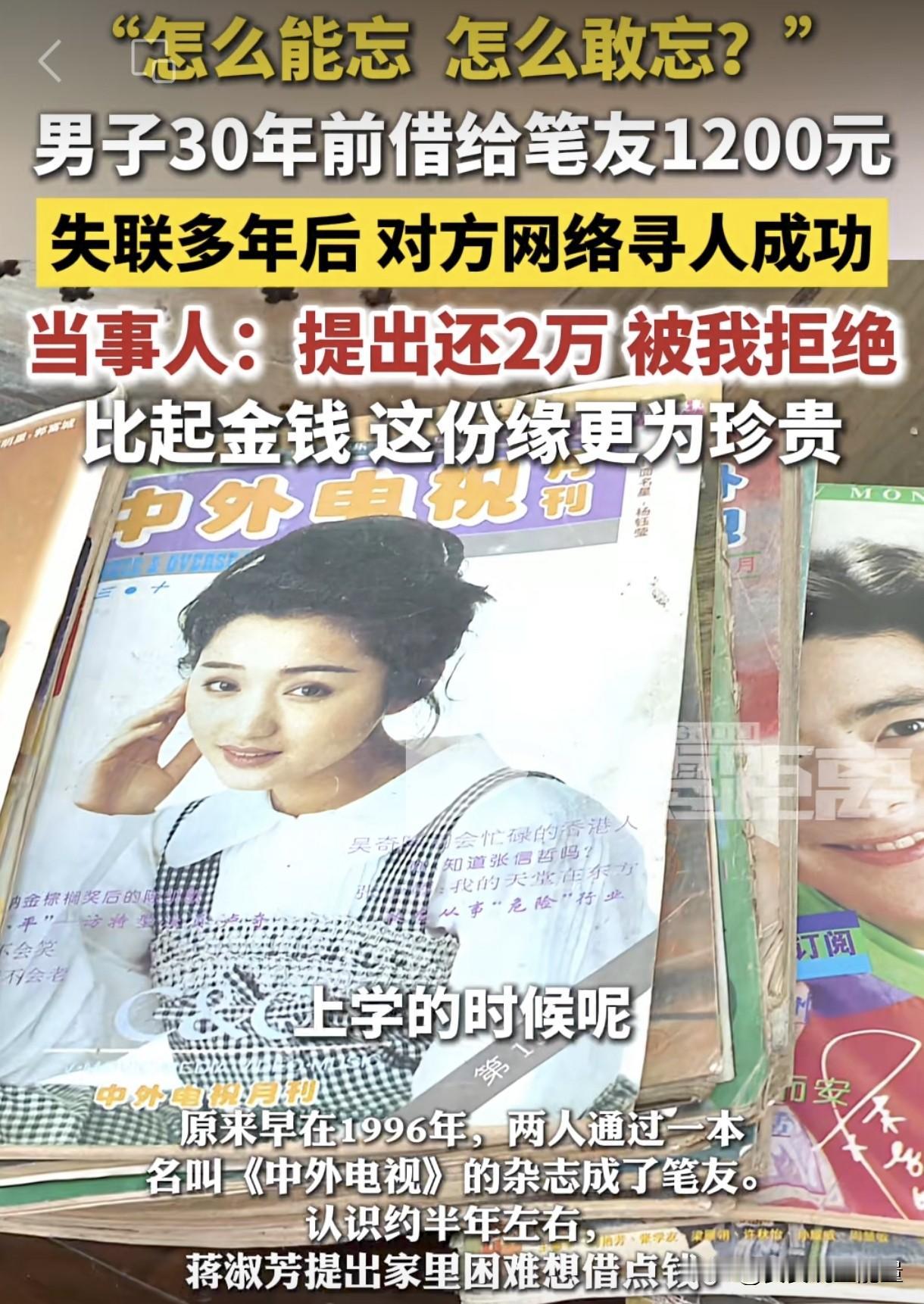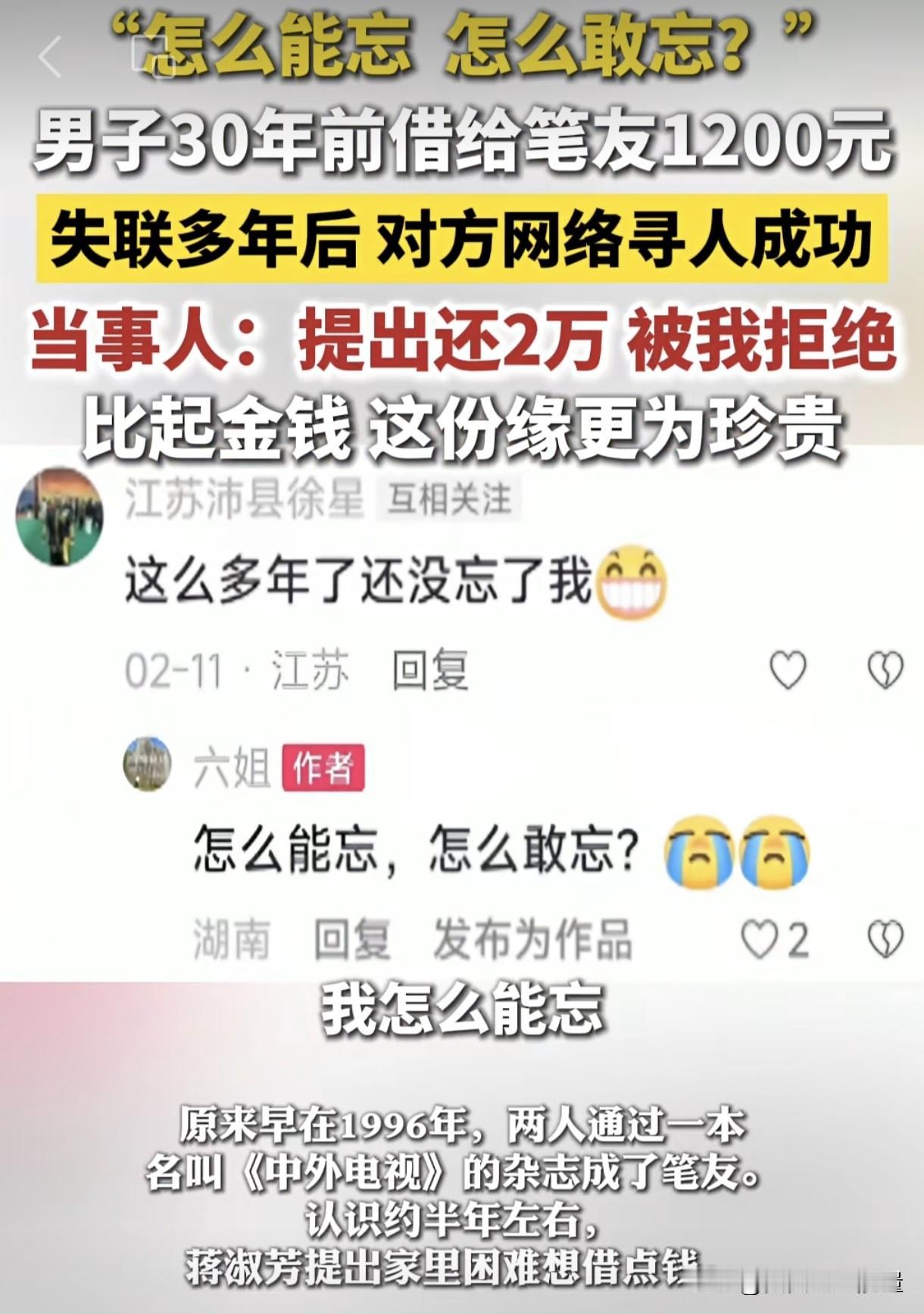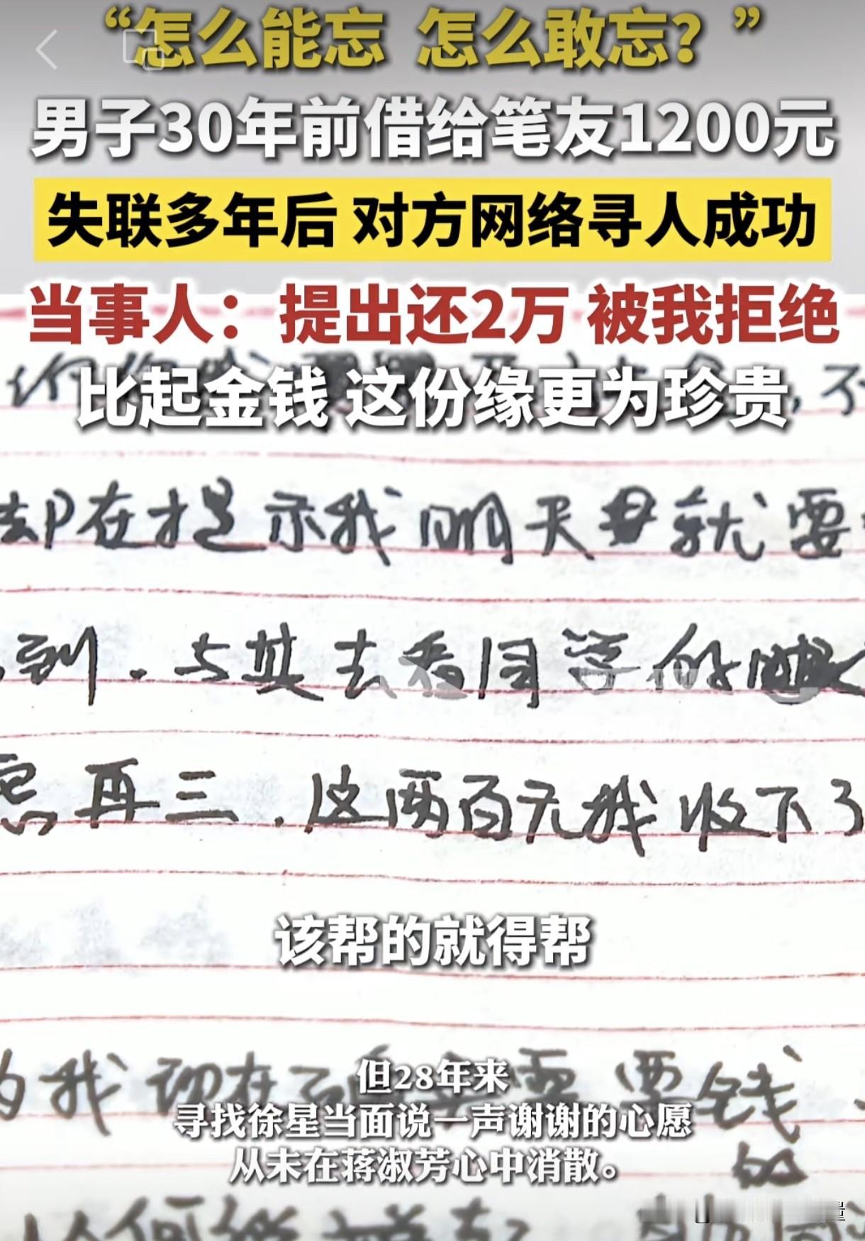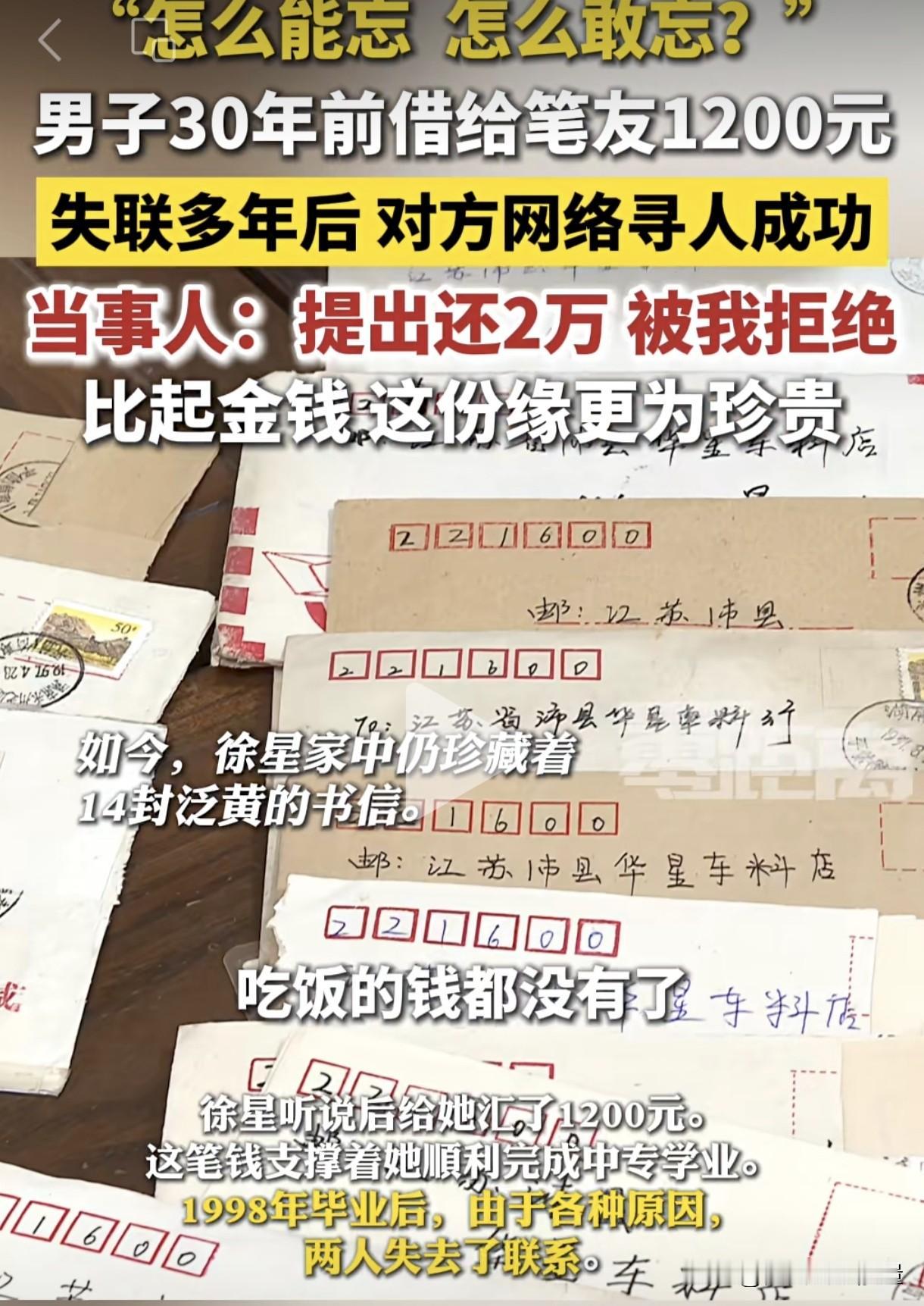 如今30年过去了,那个女笔友竟然通过网络寻找他,想要报答当年的救命之恩,并提出给2万元,作为当年1200元的还款。