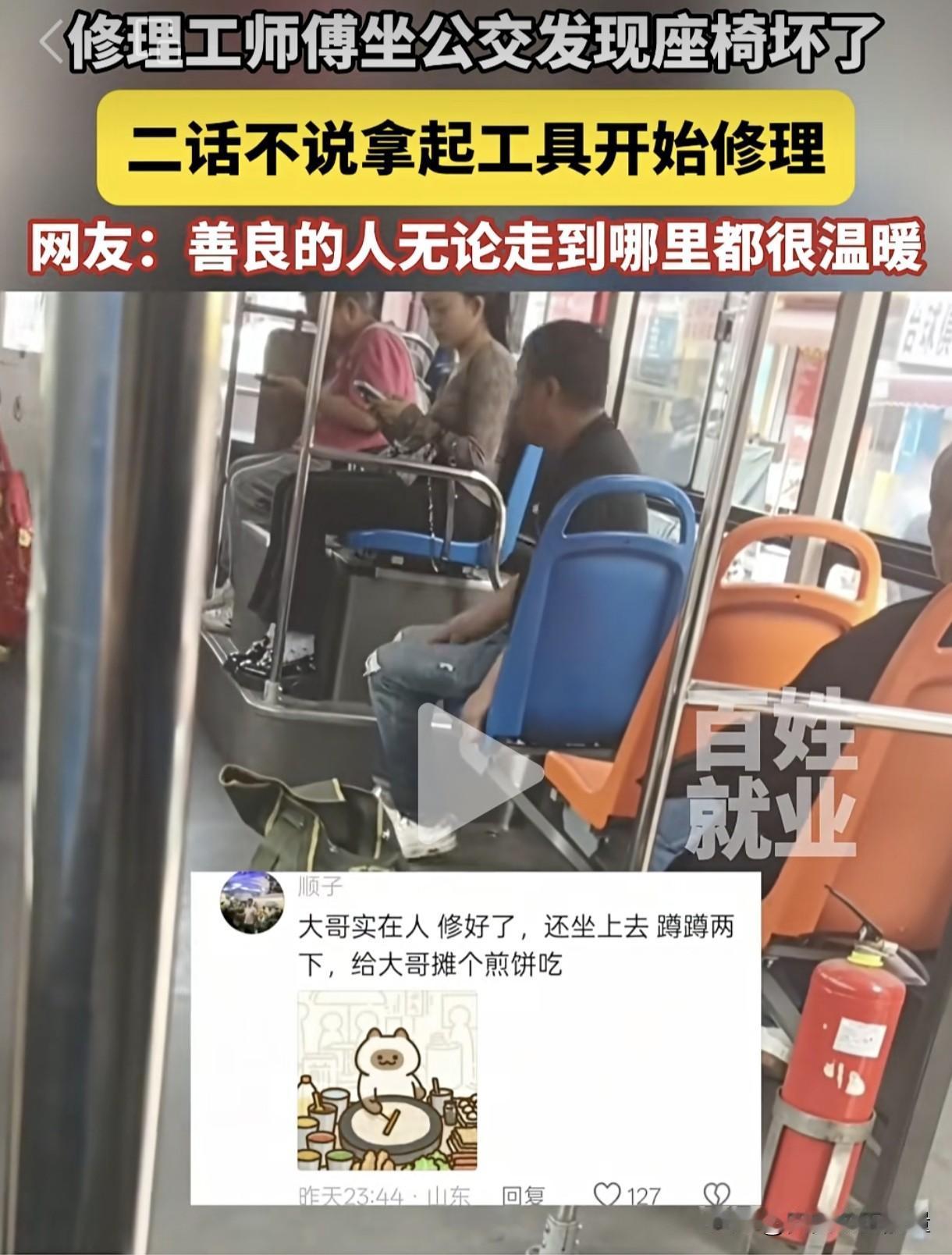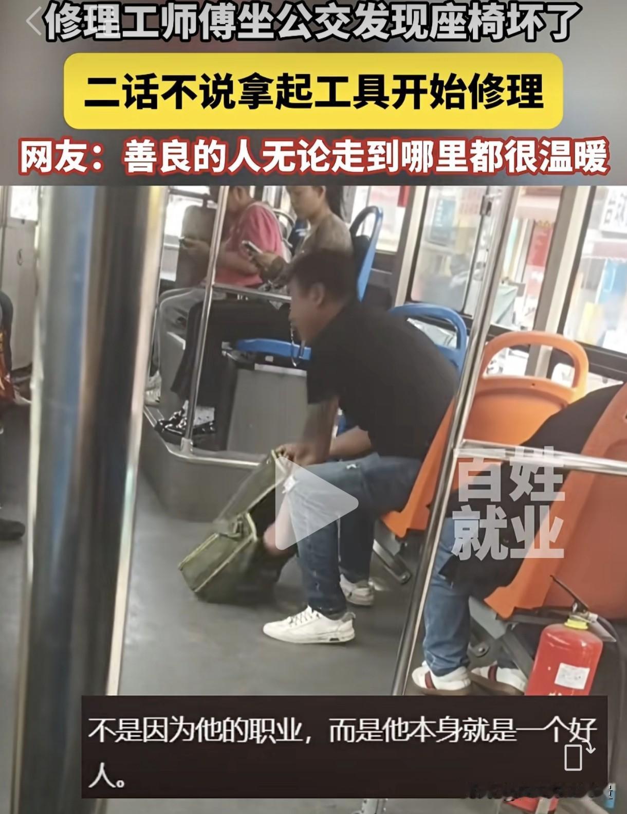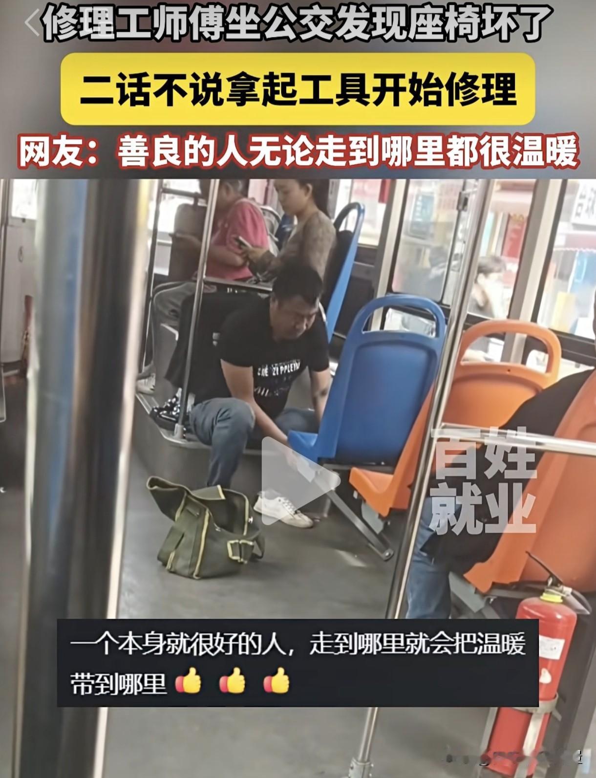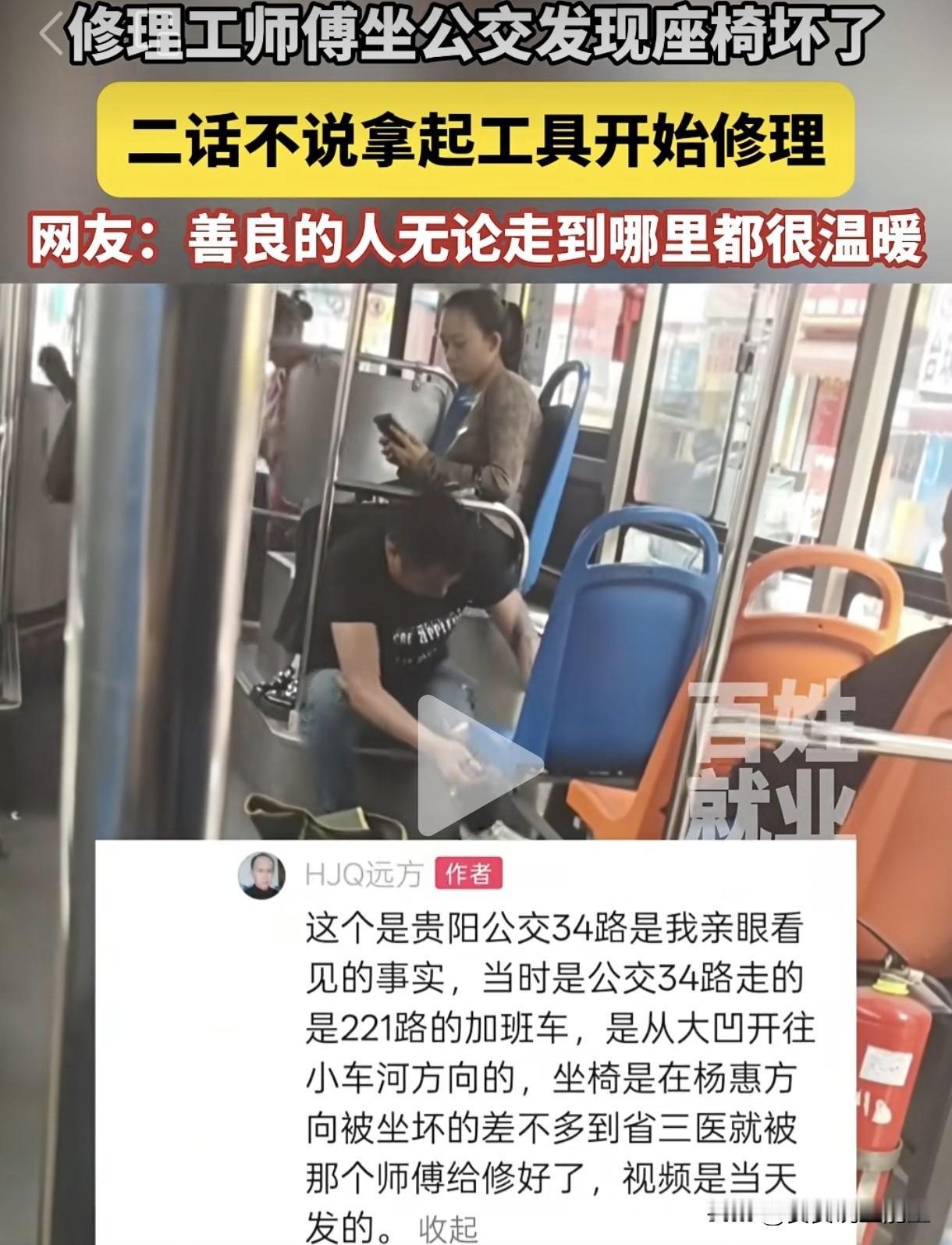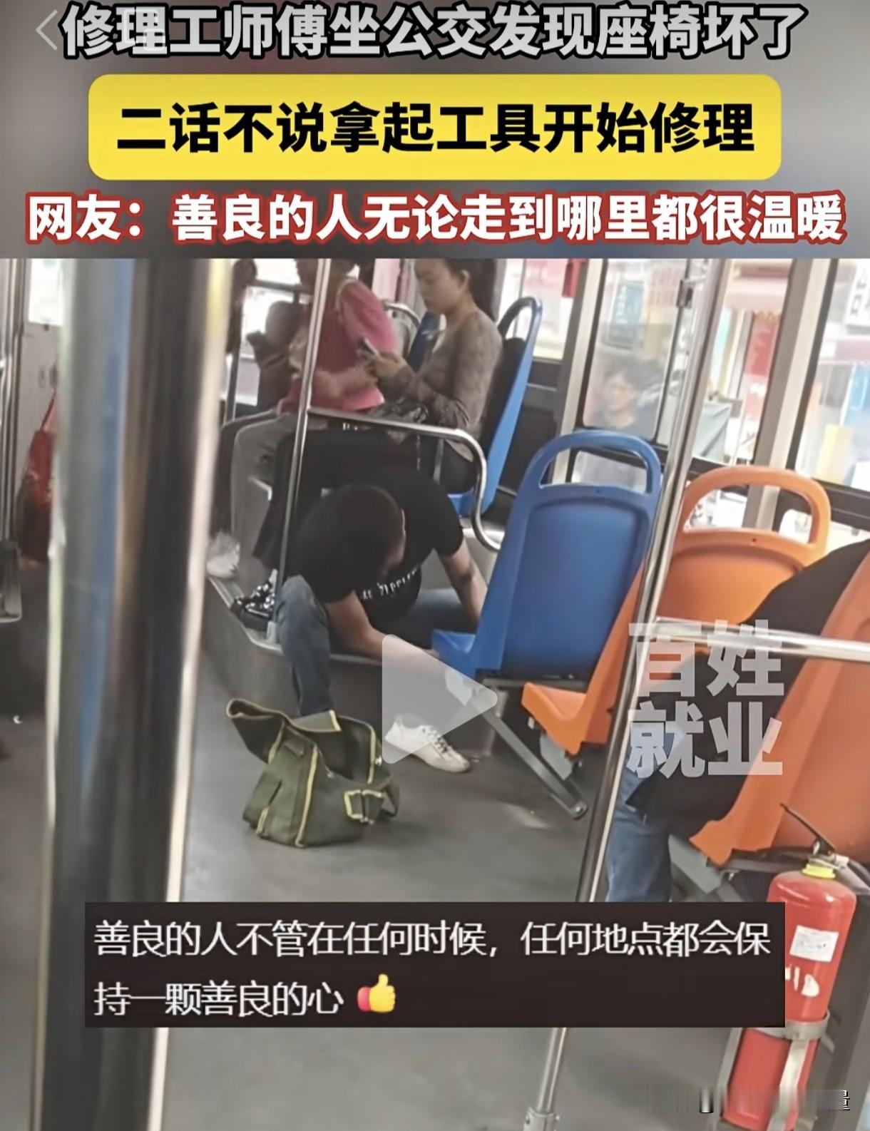 善良的人到哪里都是温暖的,他坐个公交车的功夫就修好了晃动的座椅。贵州贵阳一辆公交车上,一名修理工男子坐公交车时发现自己坐的椅子螺丝松了,晃得厉害。