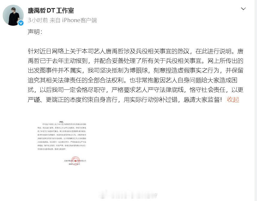 唐禹哲工作室声明唐禹哲已于去年主动报到 17日,发声明回应兵役相关事宜的热议,称唐禹哲已于去年主动报到,并配合妥善处理了所有关于兵役相关事宜。网传的“自首前还拍出发图”并不属实:“我司坚决抵制为博眼球,刻意捏造虚假事实之行为,并保留追究其相关法律责任的全部合法权利。”