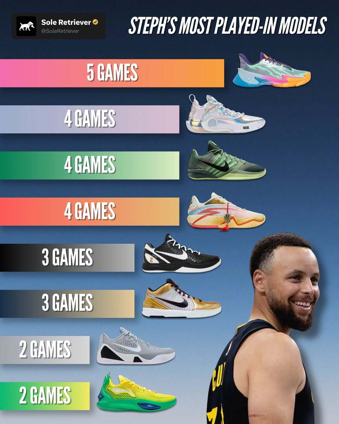库里作为球鞋自由球员的赛季已经结束,本赛季他穿着最多的是Curry Series 7,这也是得益于没解约前穿的。非UA穿的最多的是韦德的韦德之道12,随后是约内斯库的Sabrina 3还有Kai 3,科比的穿得多,但款式也多。品牌来看耐克最多,其次是安踏和UA。