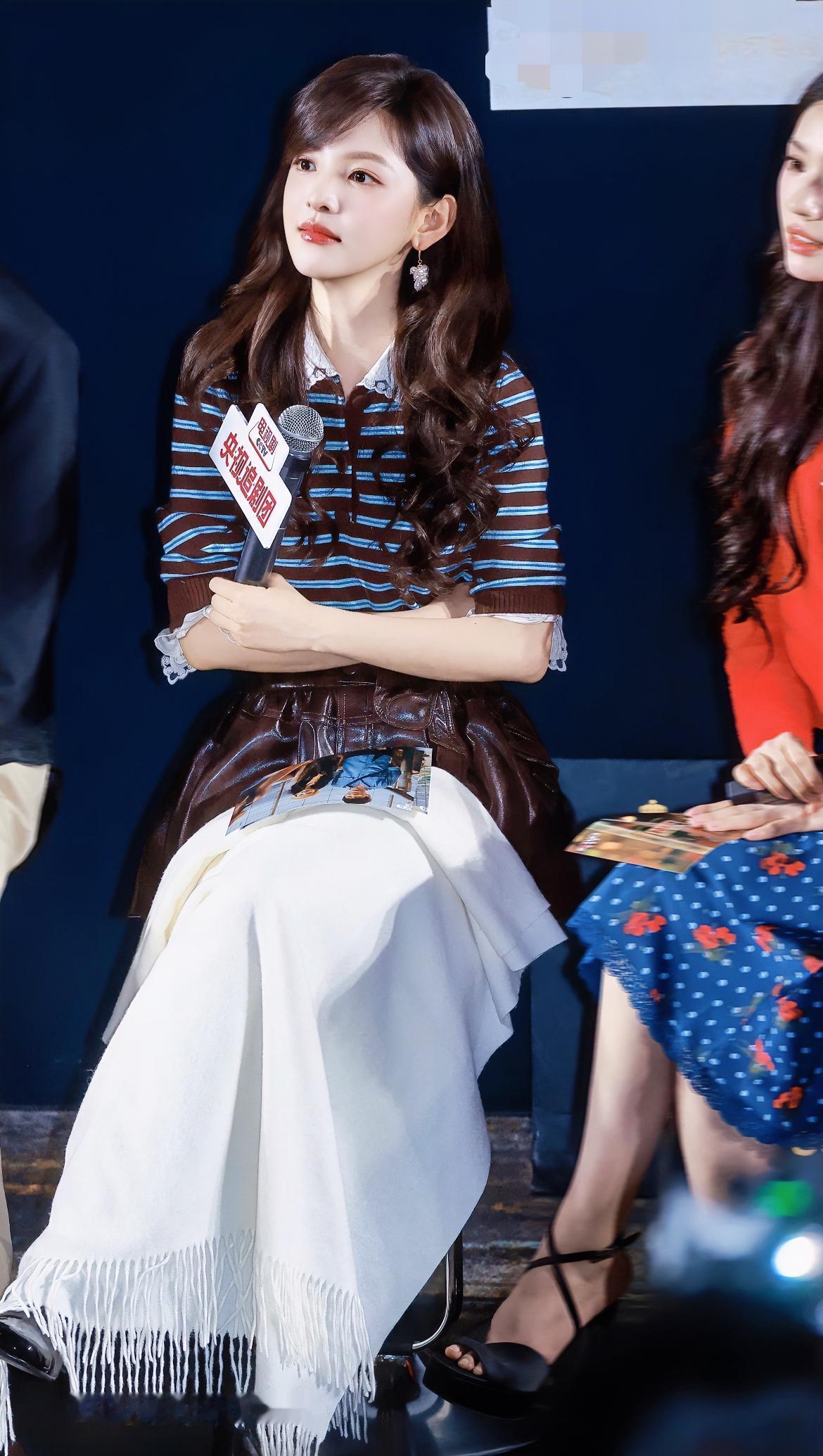 这是不久前《冬去春来》剧组参加媒体见面会时的现场照片,女主章若楠的这一身穿搭实在