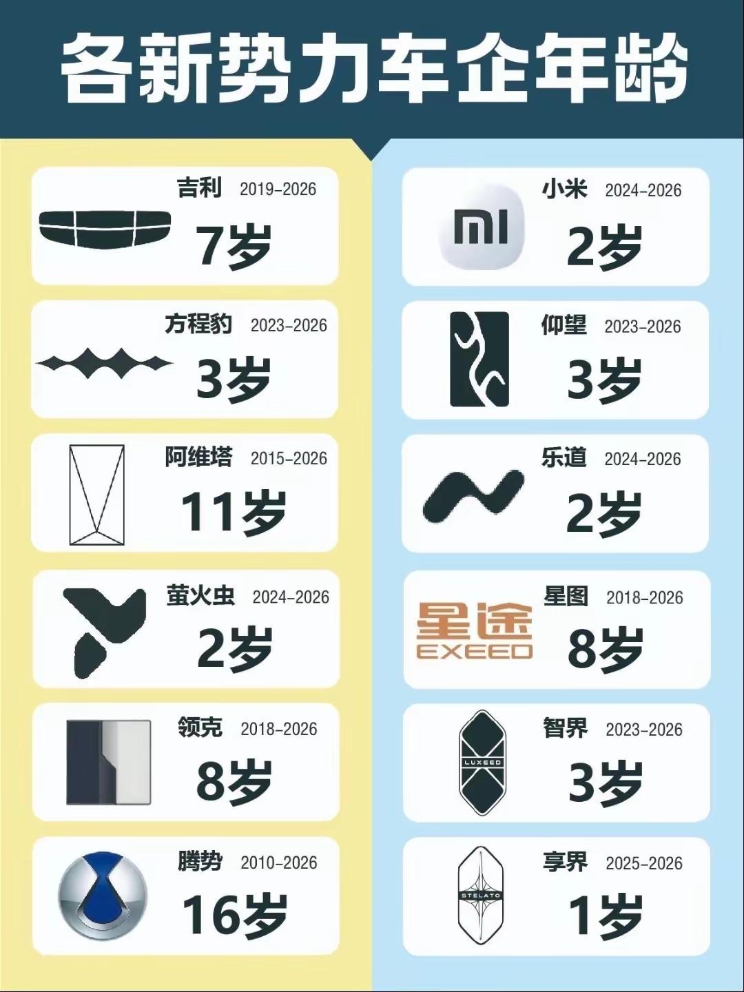 一张车企年龄榜,撕开了新势力赛道的残酷真相。比亚迪31岁、特斯拉23岁,是赛道里名副其实的“老大哥”;蔚来、小鹏、理想、零跑、阿维塔、极狐等10岁以上品牌,也算得上久经沙场的“中生代”;而享界、小米、乐道等品牌,才刚满1-3岁,却已冲进市场搏杀。