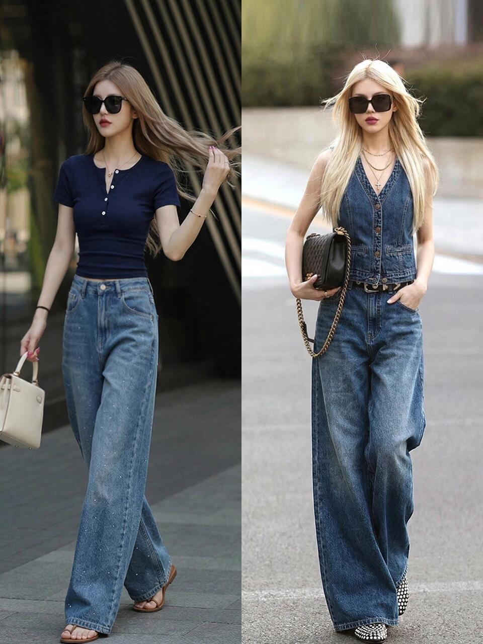 阔腿牛仔裤是显瘦神器,搭配白背心、针织衫或衬衫,松弛感拉满;