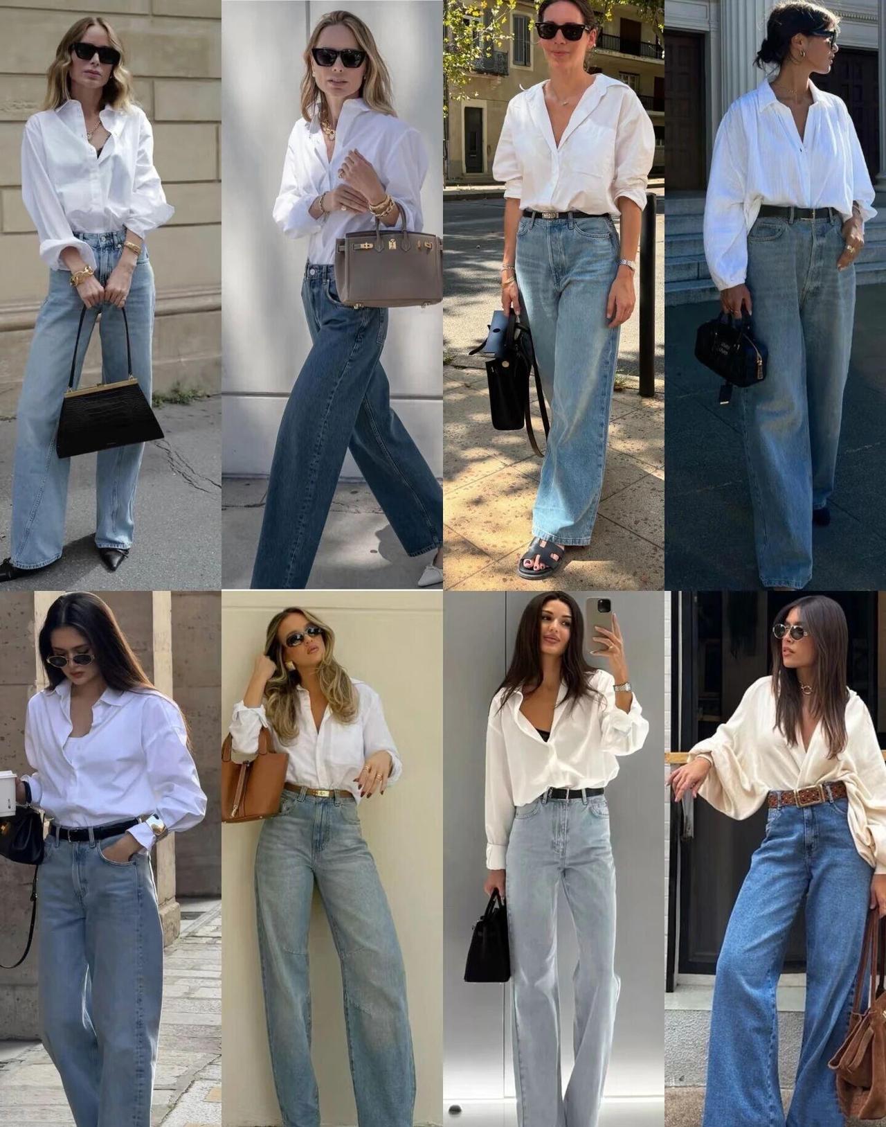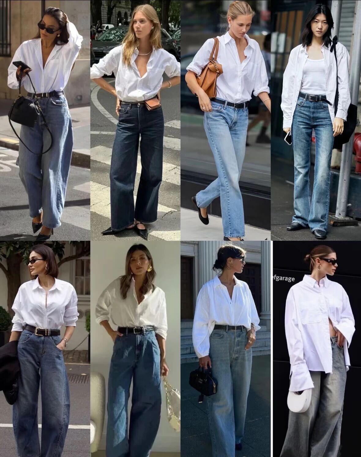 白衬衫怎么穿时尚好看? 一件白衬衫就能解锁N种高级穿搭。 搭配高腰阔腿牛仔裤,随