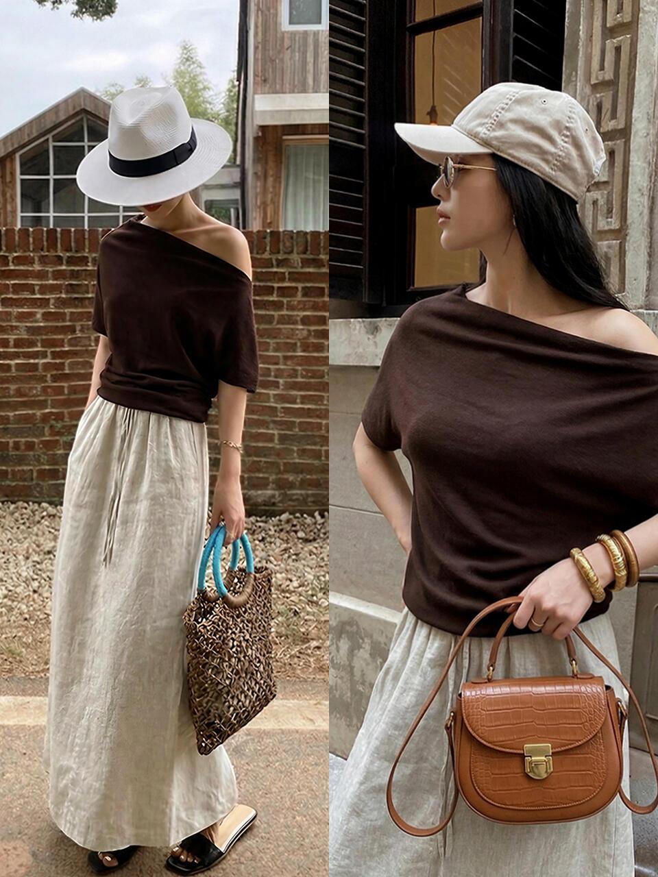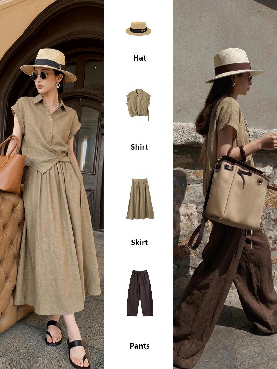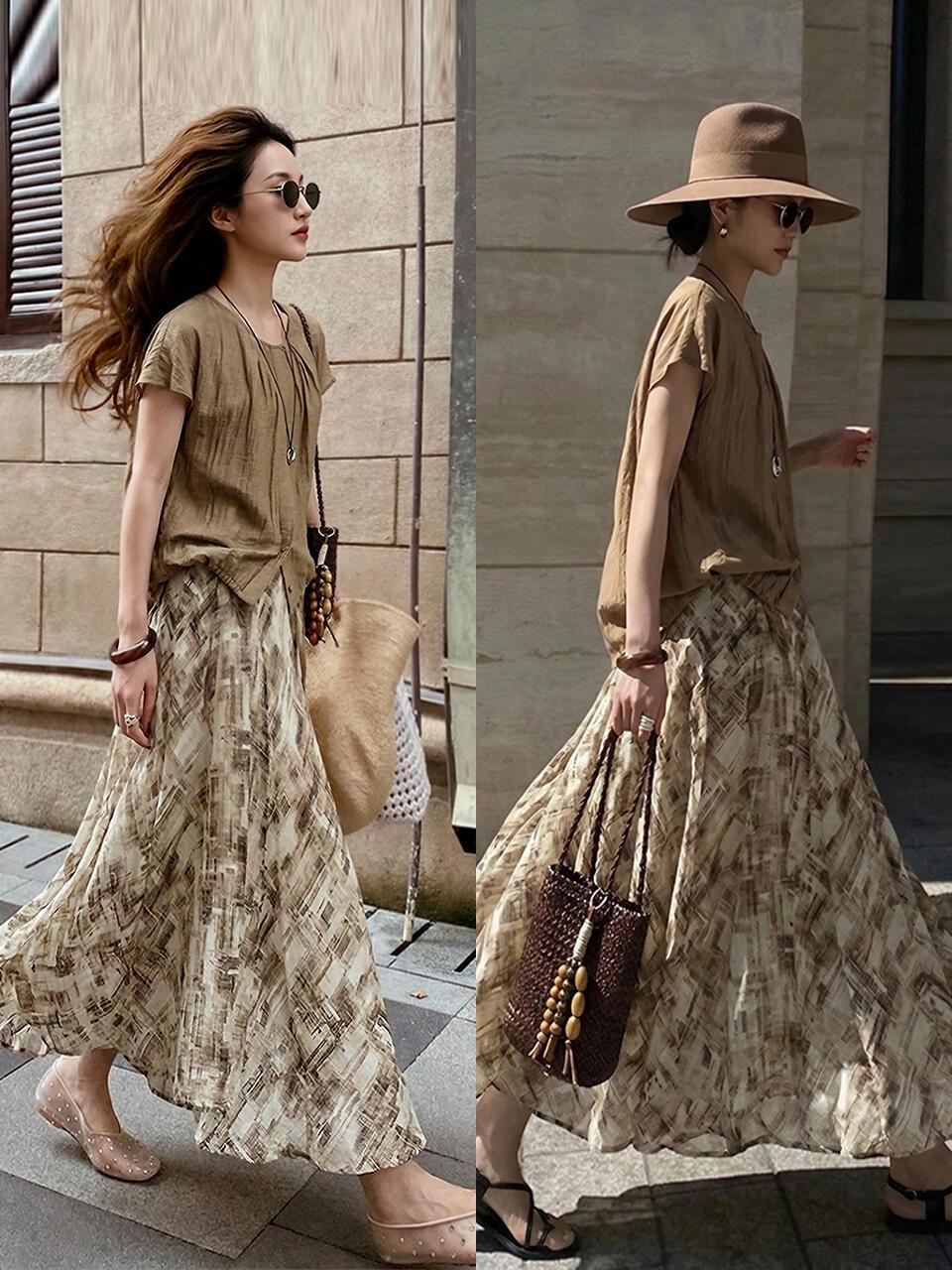 米白针织搭咖色大摆裙,温柔又显气质;同色系亚麻套装,慵懒氛围感拉满,通勤度假都适配。用深浅咖色做层次,搭配草编包、礼帽等配