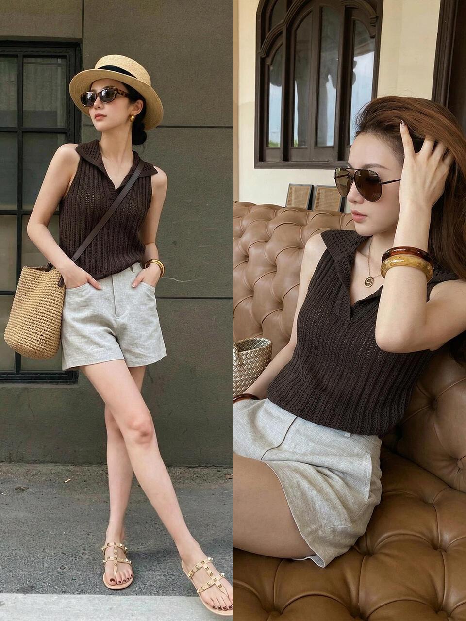 自带松弛感的大地色系,是永不过时的穿搭王牌。深咖针织配浅麻短裤,利落又随性;