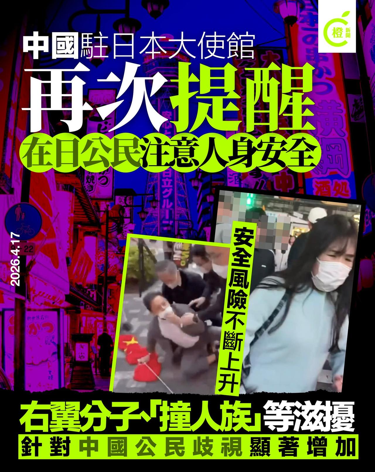 我国大使馆提醒在日中国公民加强自我保护,儘量结伴外出,避免前往治安较差区域。