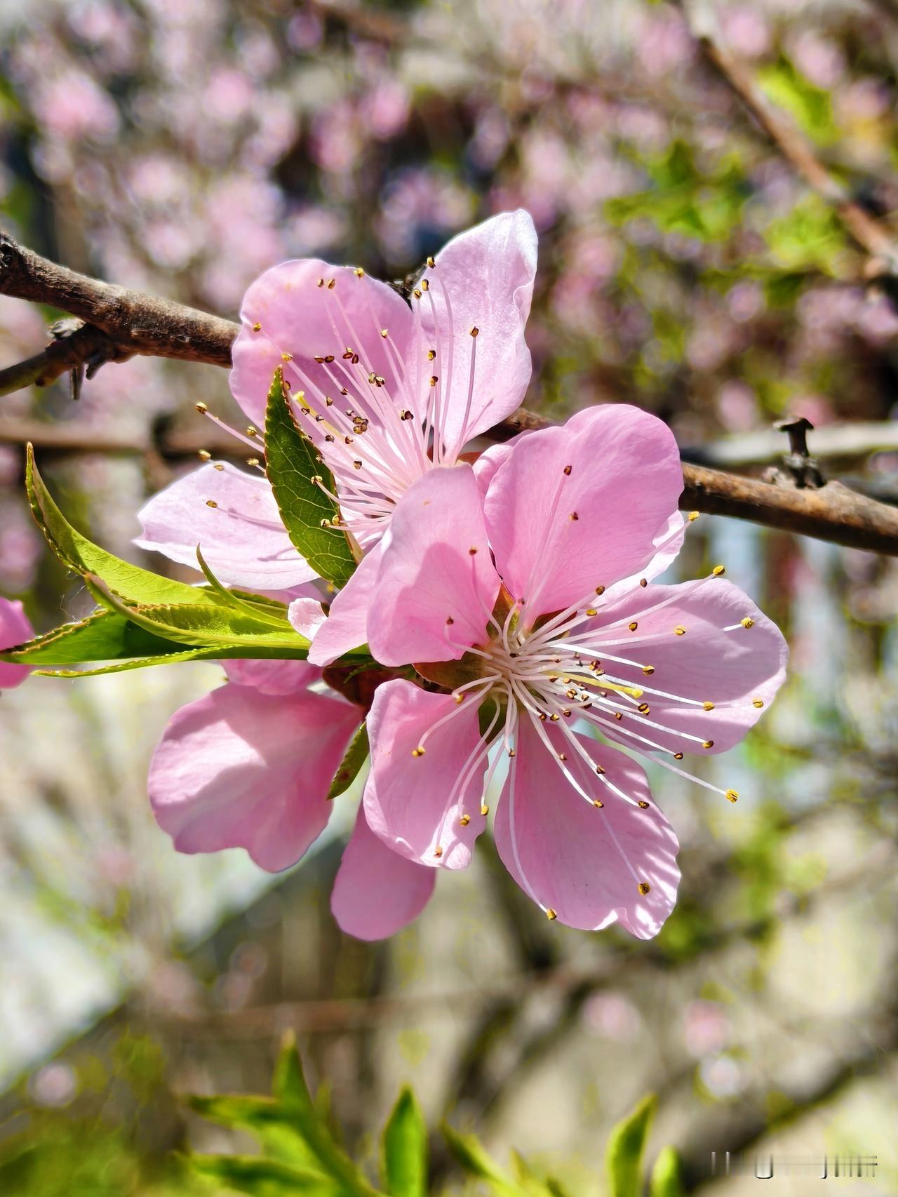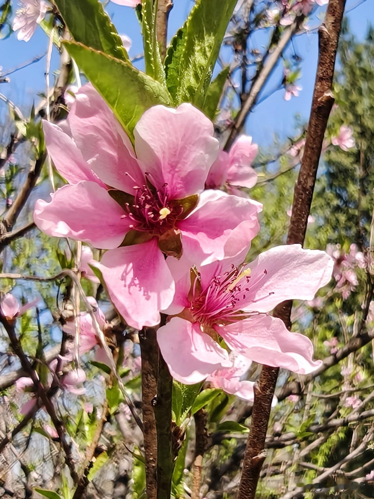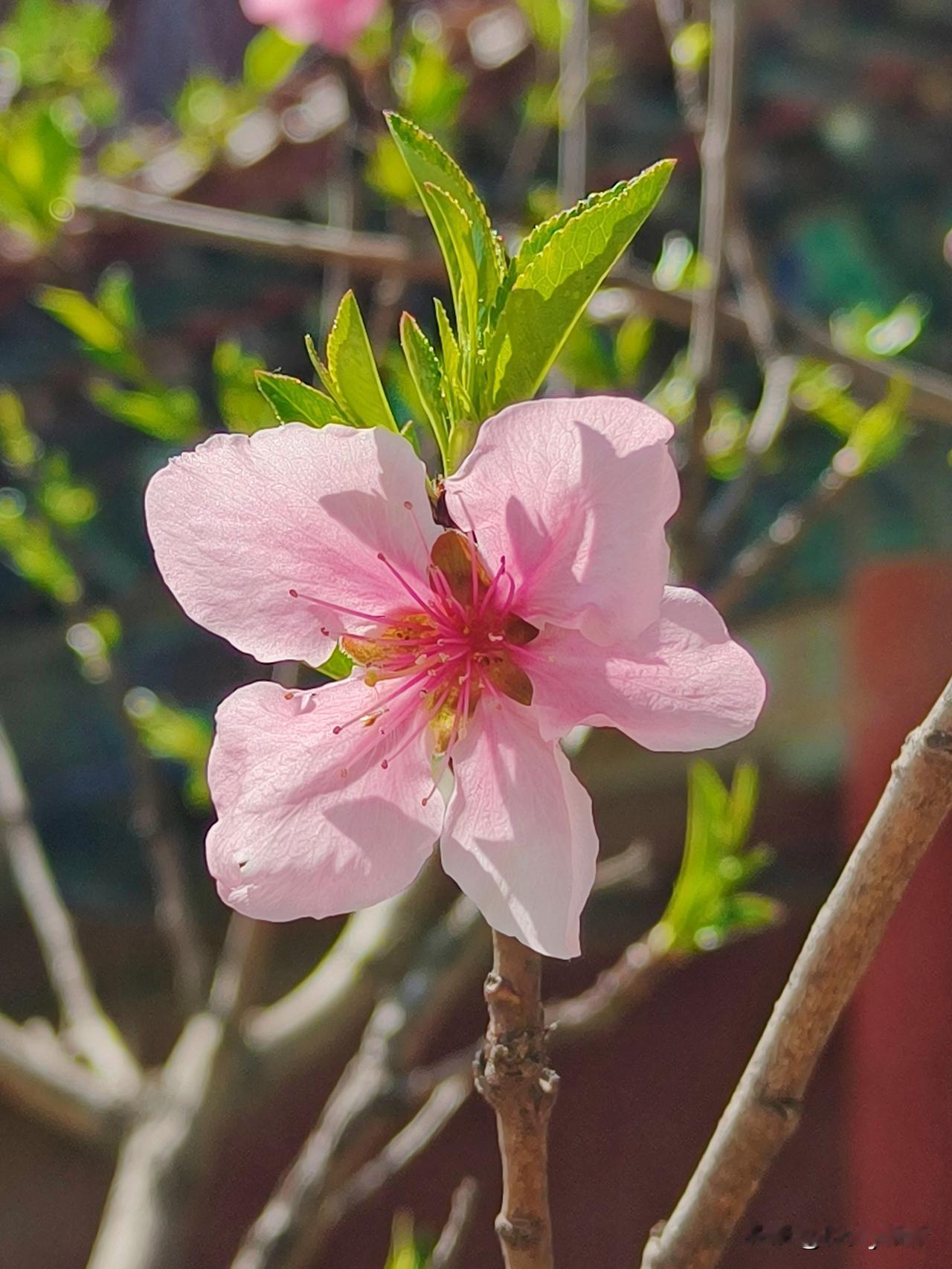 七律·桃花 东风吹暖满庭芳,桃蕊争开映画墙。 艳若丹霞铺野径,清如淡墨染诗行。