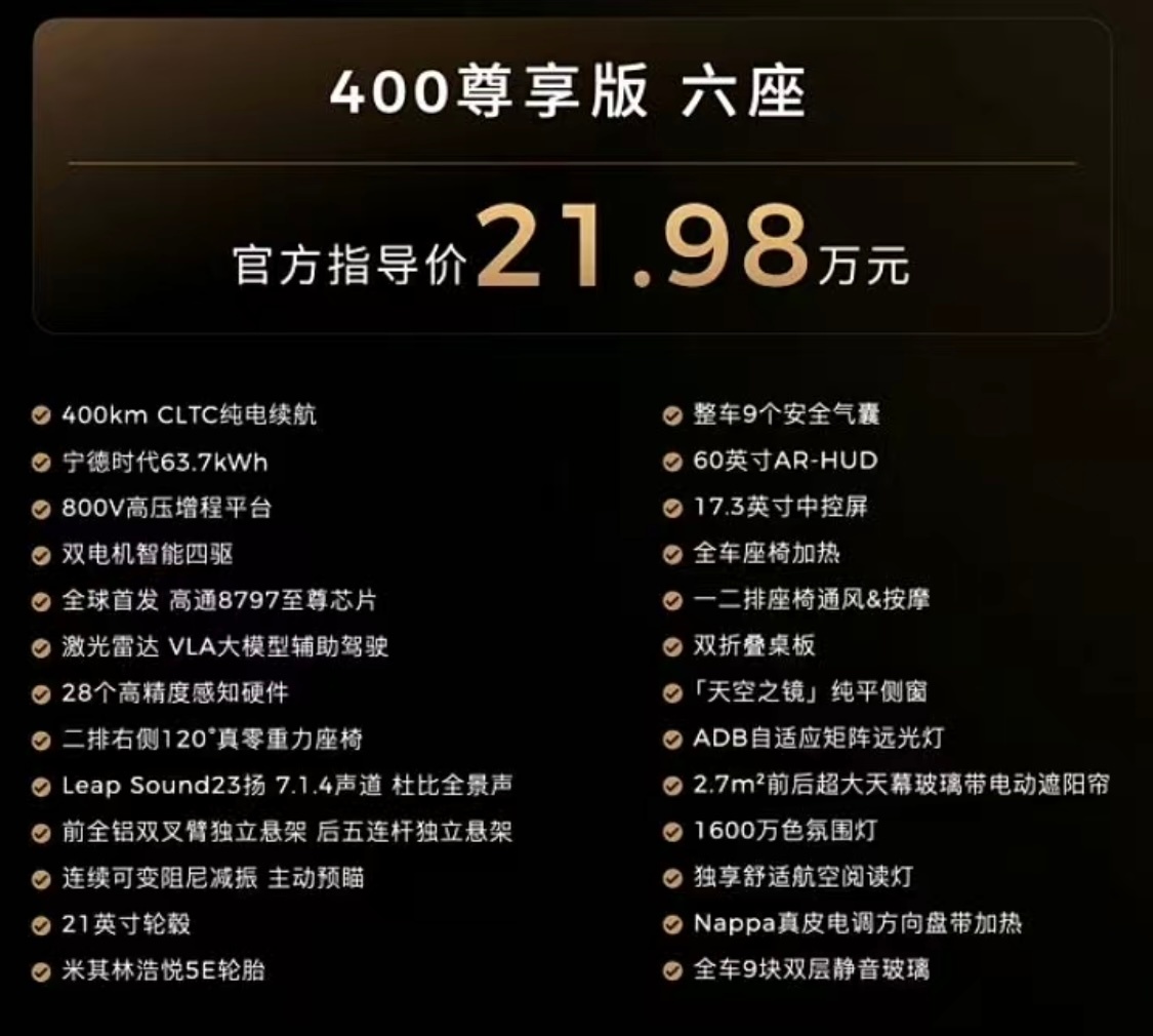 21.98万:增程400尊享六座,单8797芯片+CDC,全系标配激光雷达全场景智驾、四驱、60英寸AR-HUD