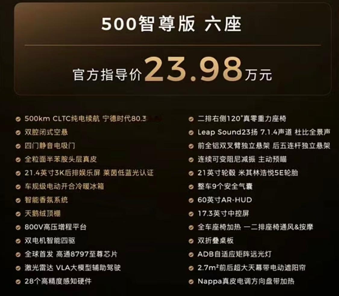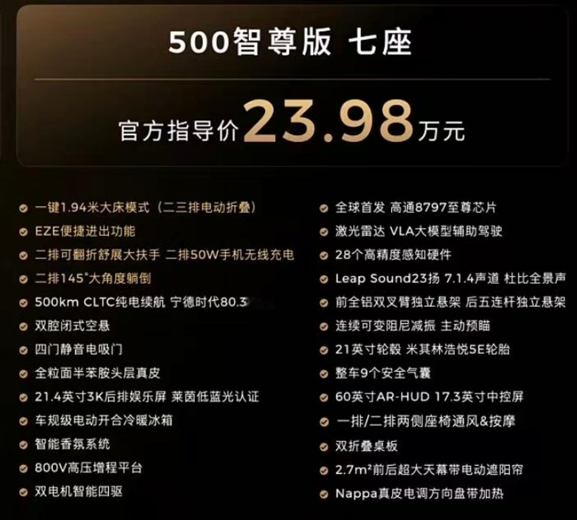 23.98万:增程500(可选六座或七座)或者纯电620智尊六座,限时免费升双8797芯片,加双腔闭式空悬,续航升级