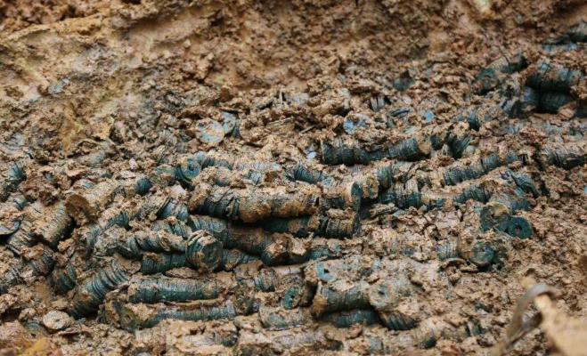 不是预想中的砂石,而是一堆带着湿润泥土、锈迹斑斑的圆形物件,边缘还隐约能看到模糊的文字印记。