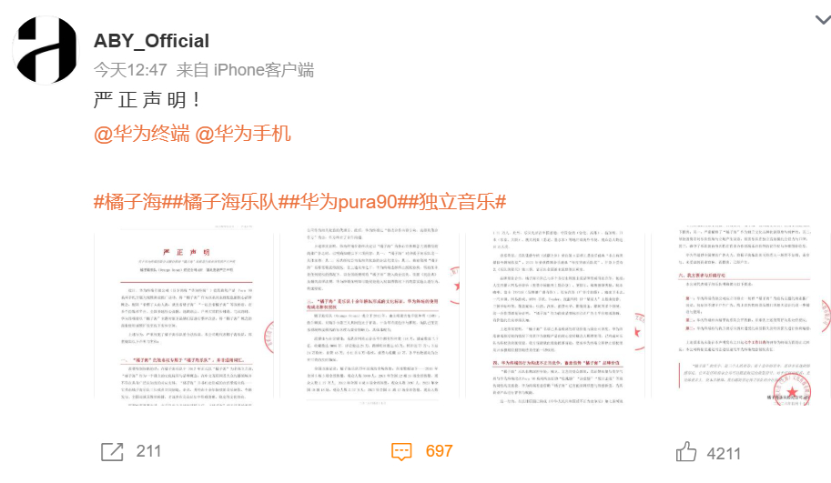 橘子海指控华为侵权 橘子海乐队发声明指控华为侵权,称华为用了他们字体、文案等,并