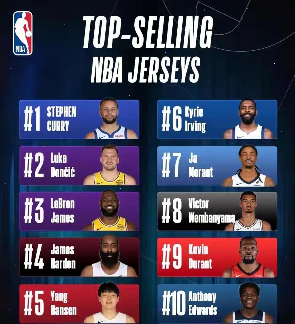 排名第1-5名的球员是库里,东契奇,詹姆斯,哈登,杨瀚森,何其荣幸啊,杨瀚森可以和NBA最顶级巨星排在一起!6-10名是欧文,莫兰特,文班亚马,杜兰特,爱德华兹,连“死神”杜兰特的球衣都卖不过杨瀚森,还有NBA“第一内线”文班亚马也是杨瀚森的“手下败将”,这样的荣光是中国职业篮球运动员从来没有过的!
