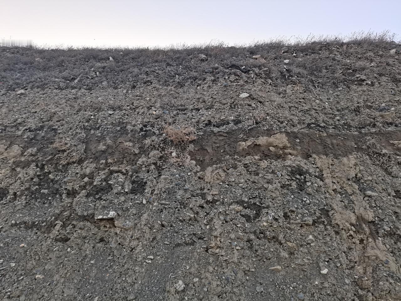 最危险的地方并非在公路上。公路南面有一道堆积而成的山包,或是路面挖下去后形成的。我在山包上发现了一道很宽的裂缝,最宽处可能至少有15公分。裂缝呈东西向,与城北主干道平行。这里的裂缝表明,这片高地的泥土正在向城北主干道倾斜。而火车的一个桥墩恰好位于这片高地上。