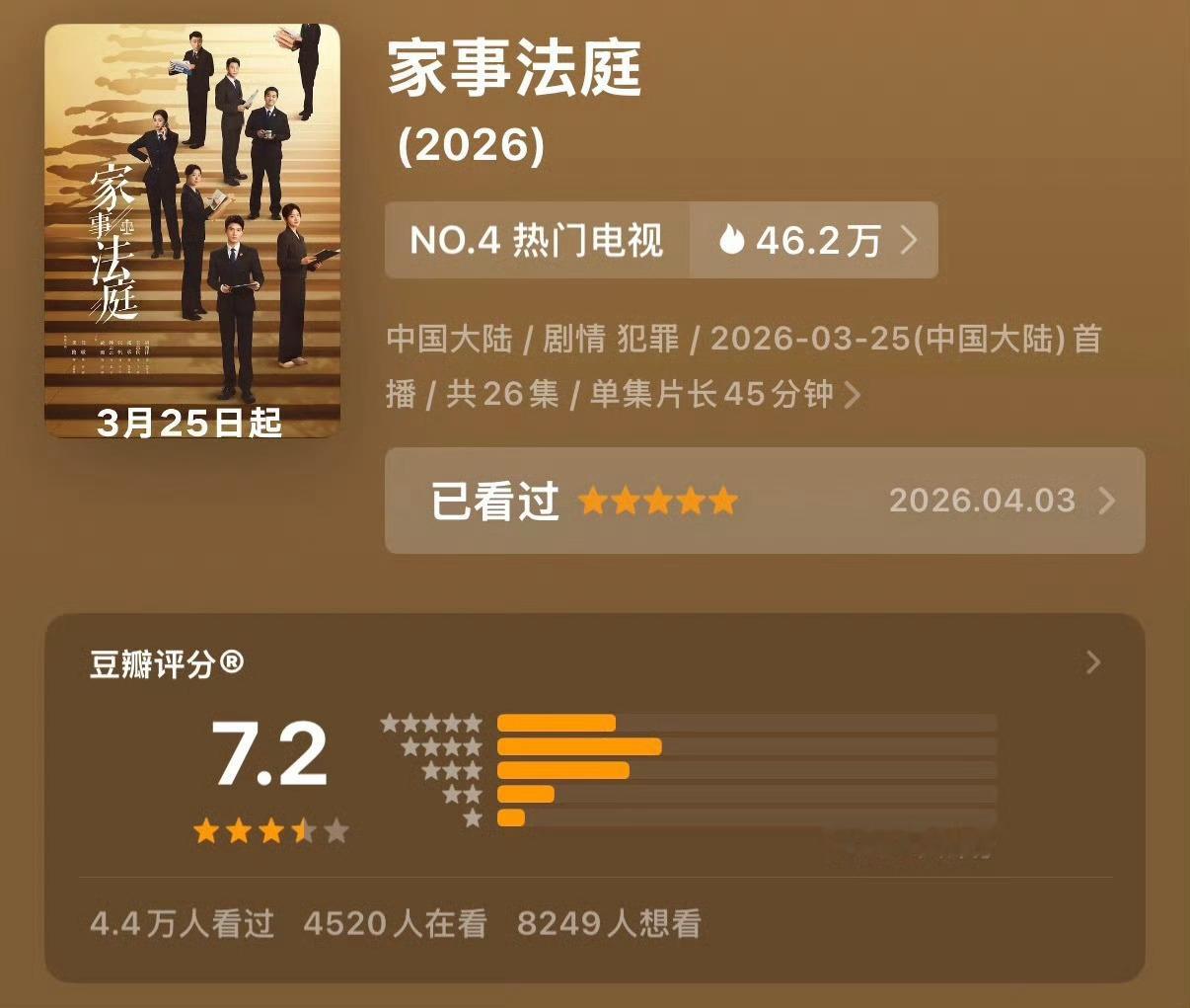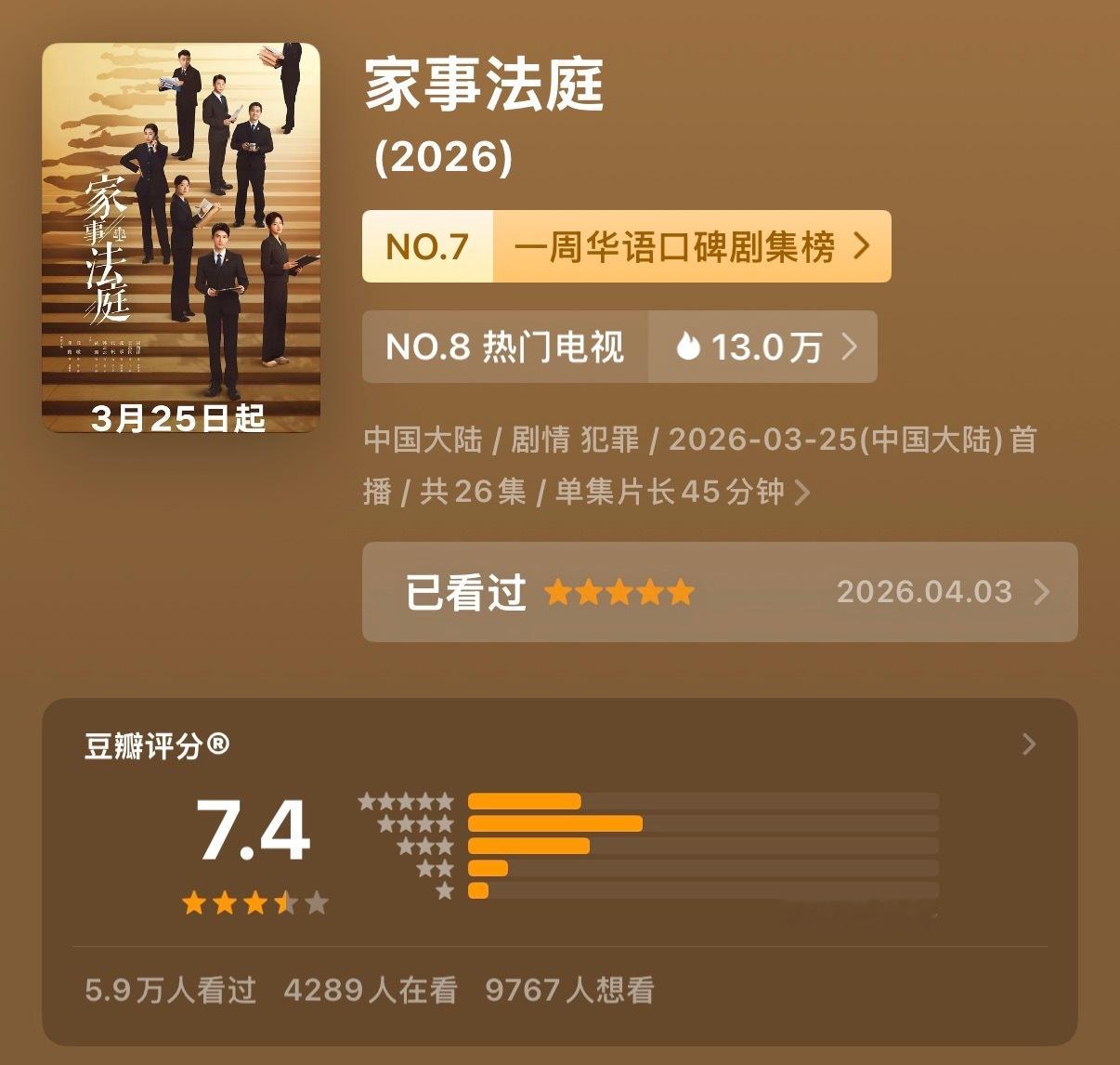 哇!我们家事法庭又涨了0.1 伟大!已7.4分了! 继续涨涨! 🎉 法庭值得