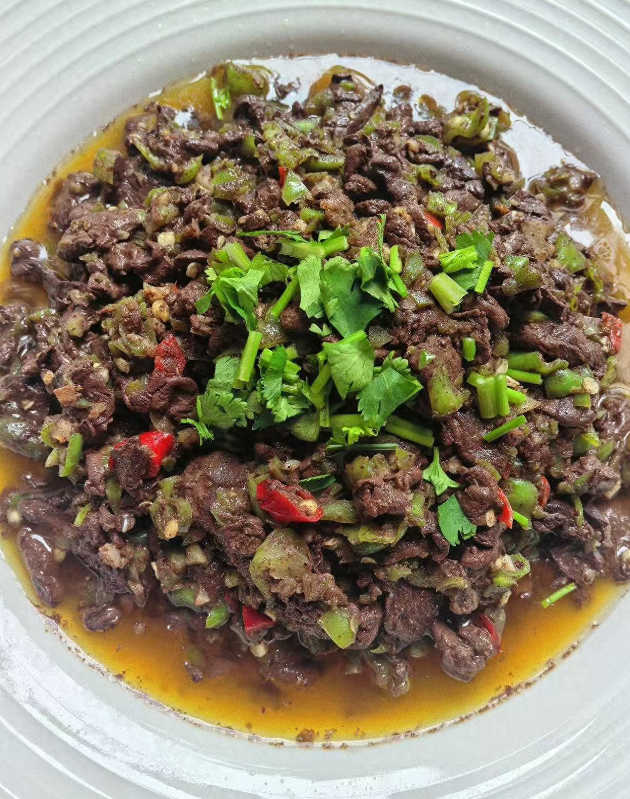 翻炒均匀出锅鸭血富含铁元素,搭配青椒提味,清润补血,中老年吃着无负担,越吃气色越好!