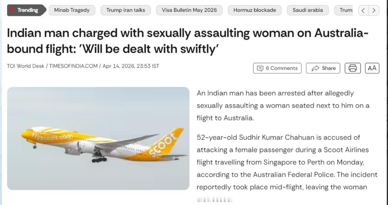 一名52岁的印度男子,在飞机上强奸了邻座的女旅客。