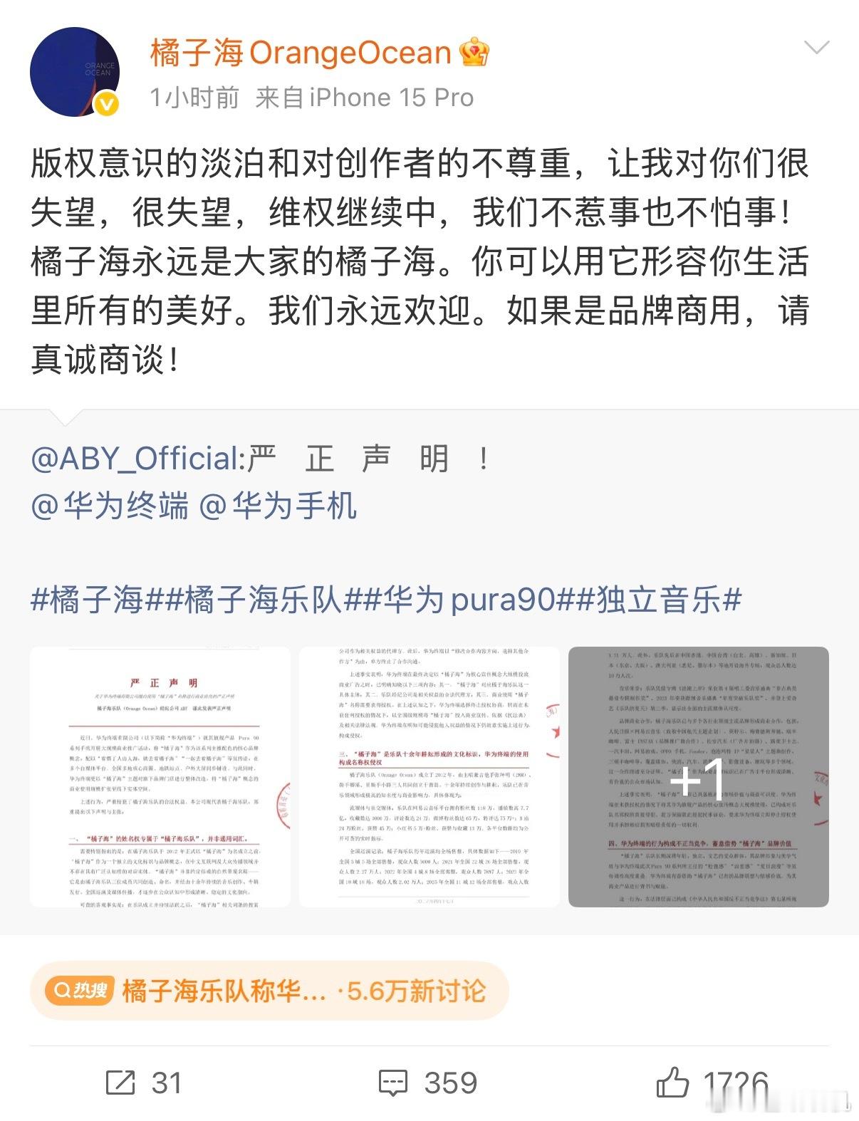 橘子海乐队称华为侵权橘子海乐队说“橘子海”是他们家的,华为用就是侵权,评论一边倒