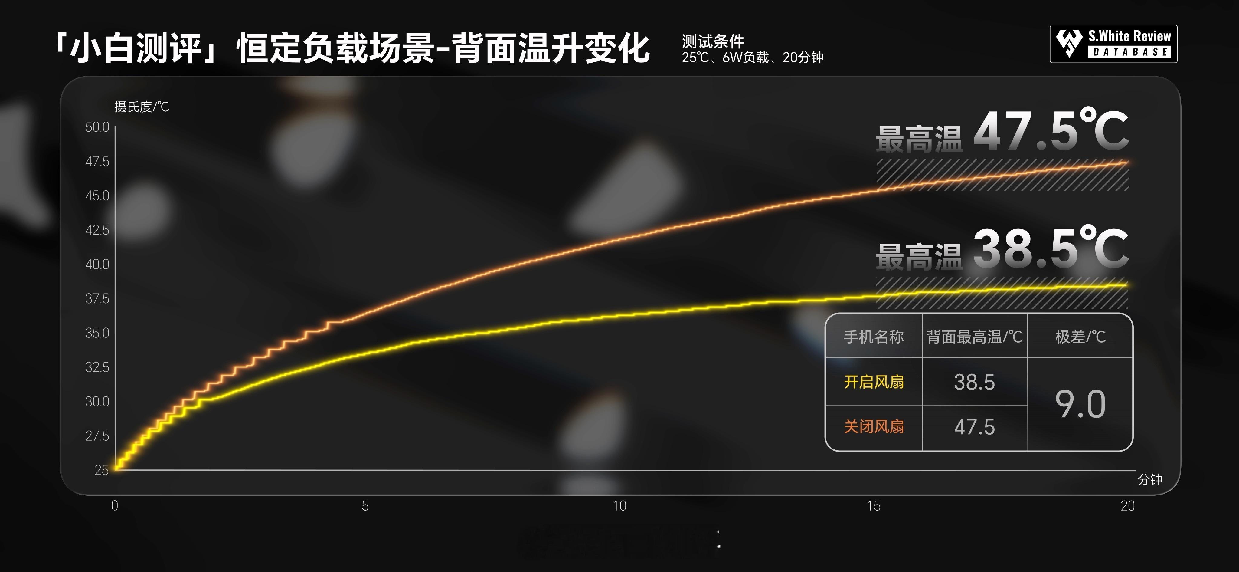 利用自然对流恒温箱,固定环境温度25度,充分冷却后,给手机一个恒定6W的负载,用热电偶全程记录风扇开关前后的温升表现。在背面最高温度的地方,通过观察20min的温升曲线,开启风扇后温升速度明显变慢,温度下降非常明显。从关风扇的47.3度降低到了38.5度,直接下降了8-9度。
