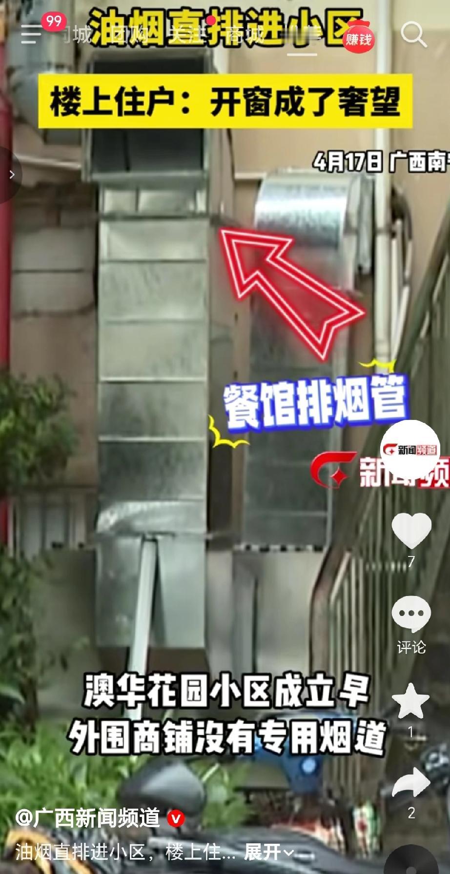 4月17日,广西南宁澳华花园翰林苑7栋。小区住户莫阿姨、李女士等反映,楼下餐馆油烟直排进小区,产生很油腻的味道,吸入后鼻腔难受,导致他们开窗成了奢望,诉求是要求餐馆取缔或整改澳华花园小区成立较早,外围商铺没有专用烟道,餐馆油烟目前只能直排。
