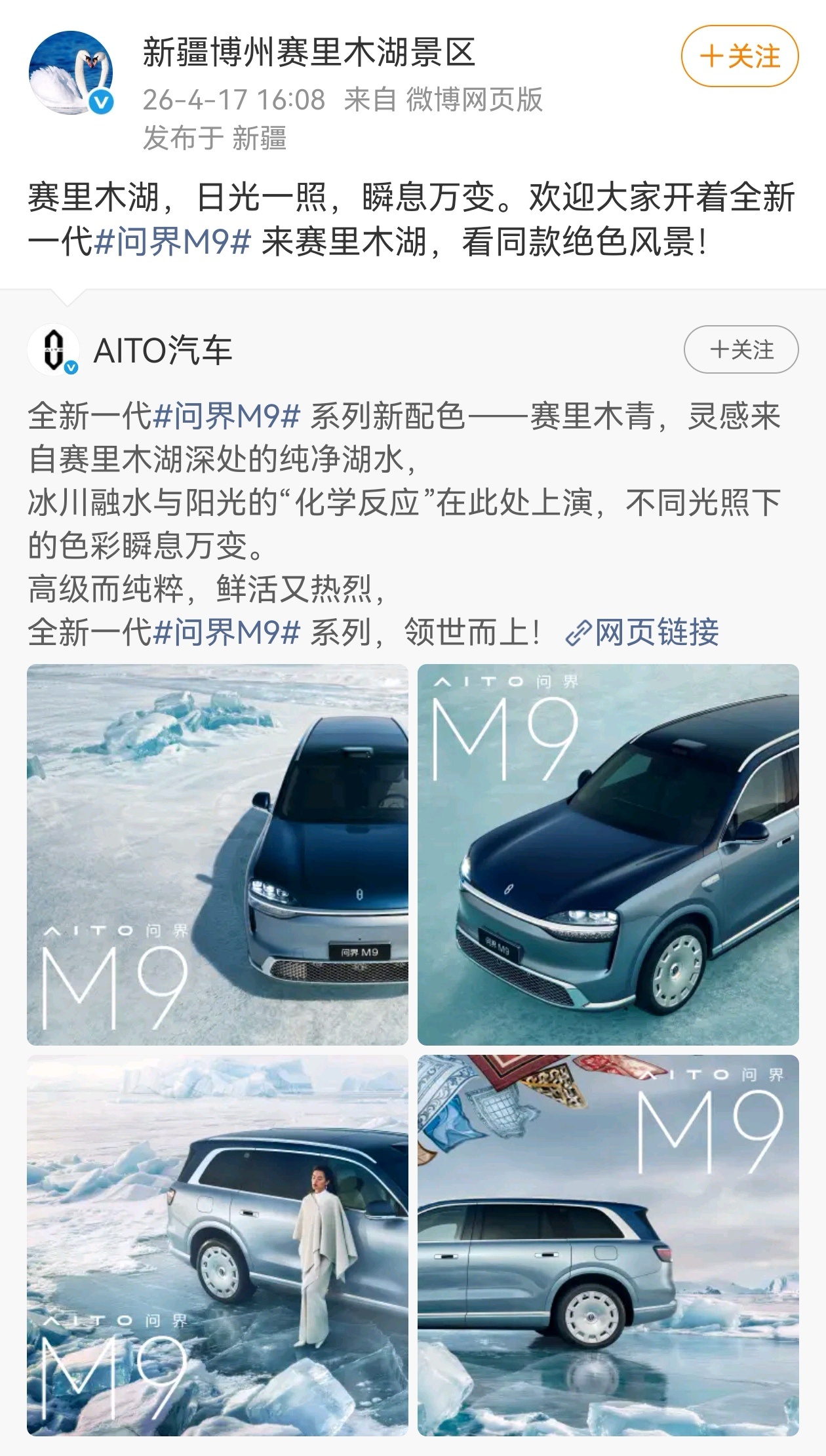 以敦煌大漠余晖、赛里木冰川融水、三亚蔚蓝海景为灵感,将自然奇境与科技旗舰美学相融,尽显豪华大气、年轻纯粹、经典先锋气质,以山河之色领世而上。新色官宣后受到三亚旅发、赛里木湖景区点赞。问界M9新车色获文旅共同认证