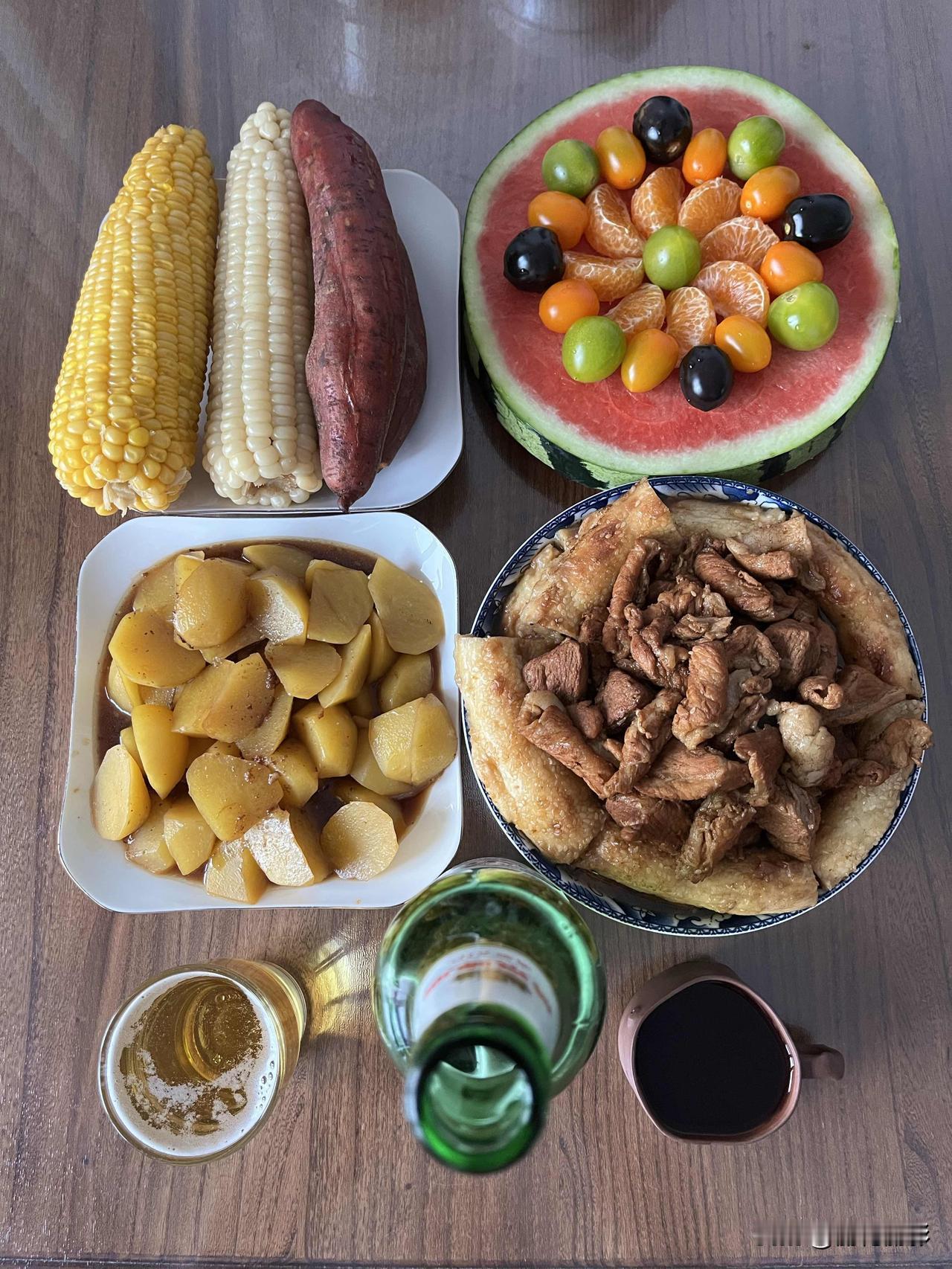 好友们晚上好!周五快乐,晚餐香香!今天的晚餐: 馕包肉 炖土豆 蒸红薯 玉米 果