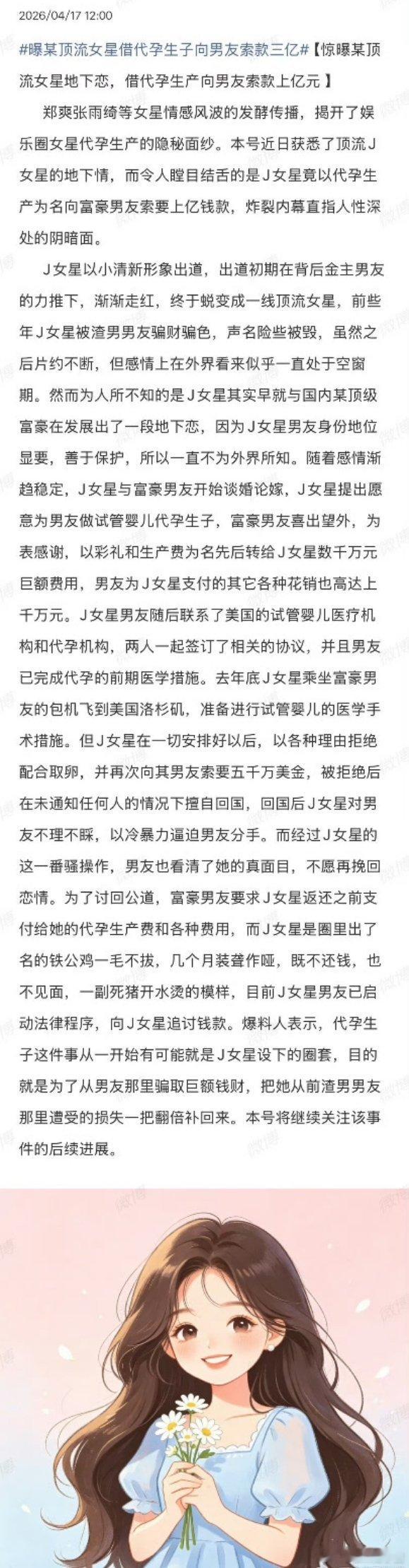 曝索要3亿的女星以小清新出道网传有位以小清新形象出道的J姓顶流女星,被爆和富豪交往时,主动提出赴美代孕生子,富豪为此付了前期费用。结果她到了美国反悔,反过来索要约3.6亿,被拒后就回国分手,富豪起诉追款,指控她设局骗财,引发全网猜测
