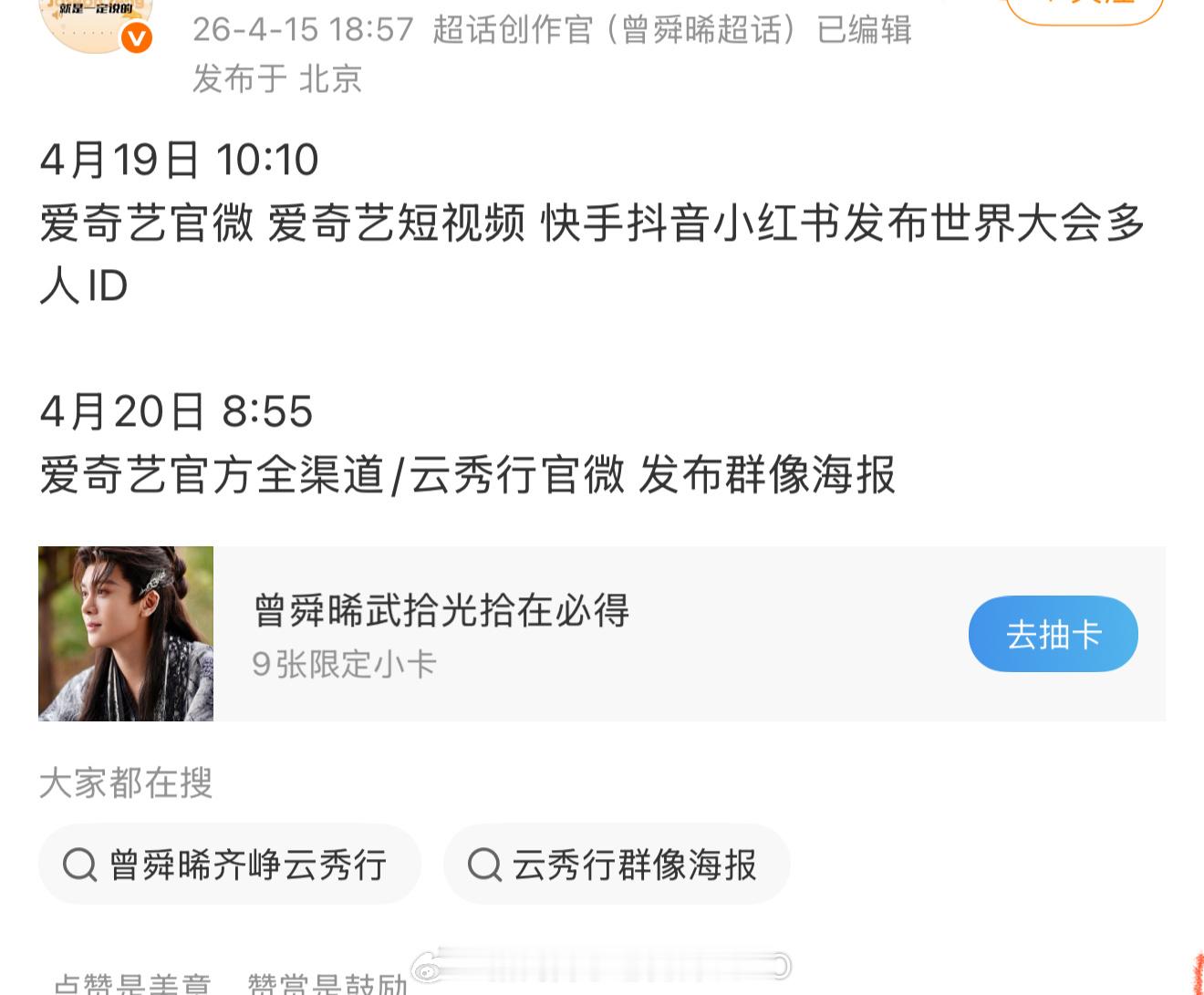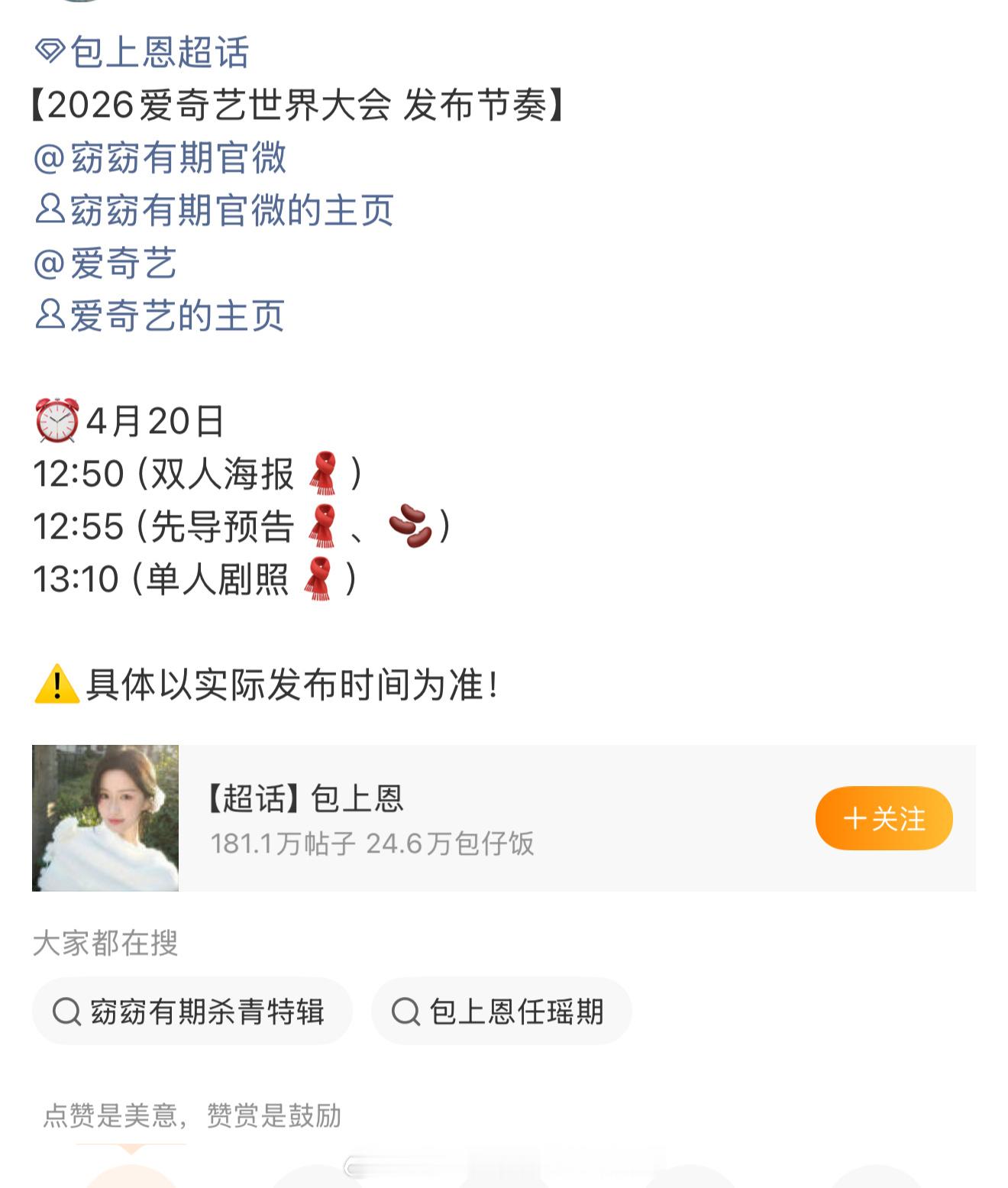 爱奇艺世界大会有物料的剧:鞠婧祎、张云龙《来战》田曦薇、胡一天《天才女友》何与、包上恩《窈窈有期》李一桐、曾舜晞、邓为《云秀行》敖瑞鹏、沈羽洁《不二之臣》敖瑞鹏、代露娃《一点浩然气》陈晓、毛晓彤《云襄传之将进酒》