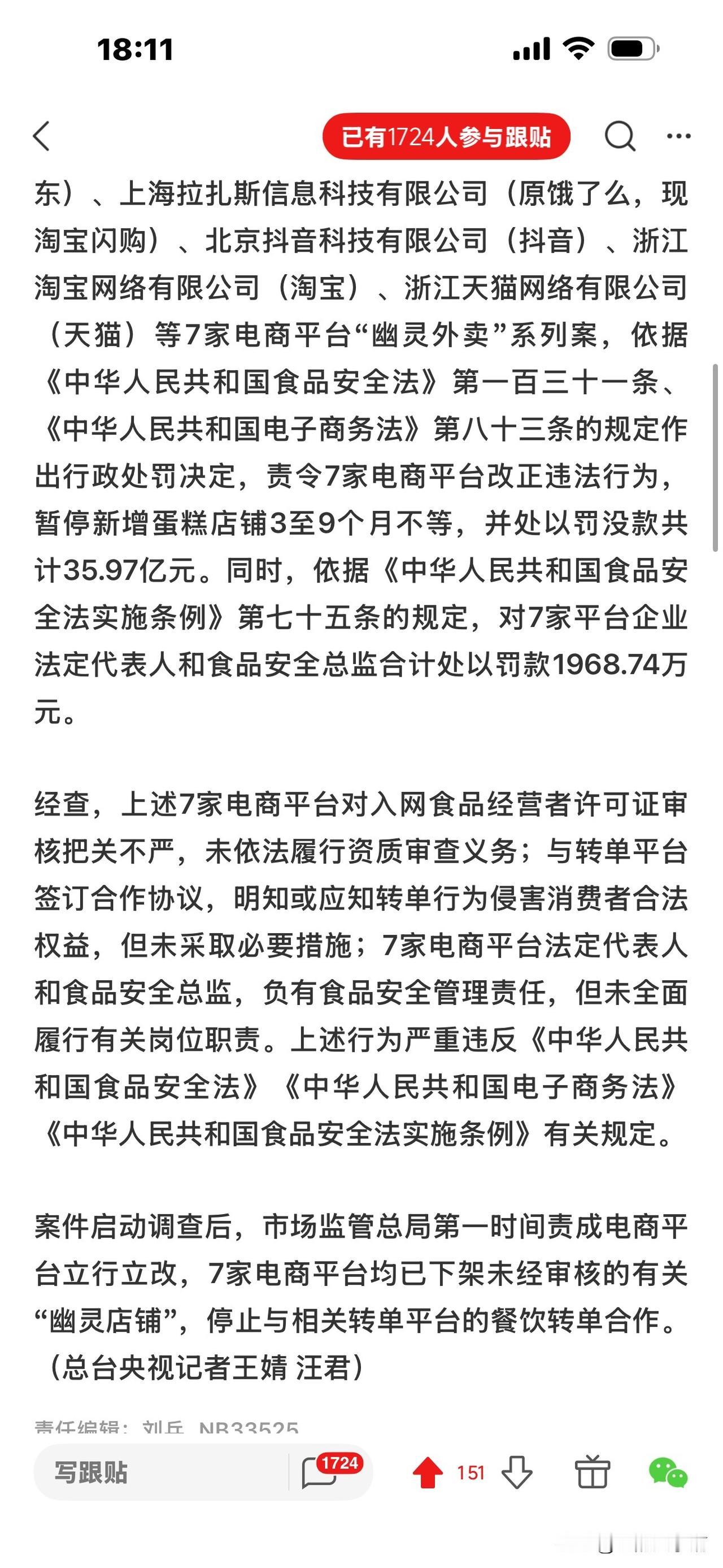 今天,我们熟悉的7家电商平台 被罚36亿元, 原因是它们都涉“幽灵外卖”案。