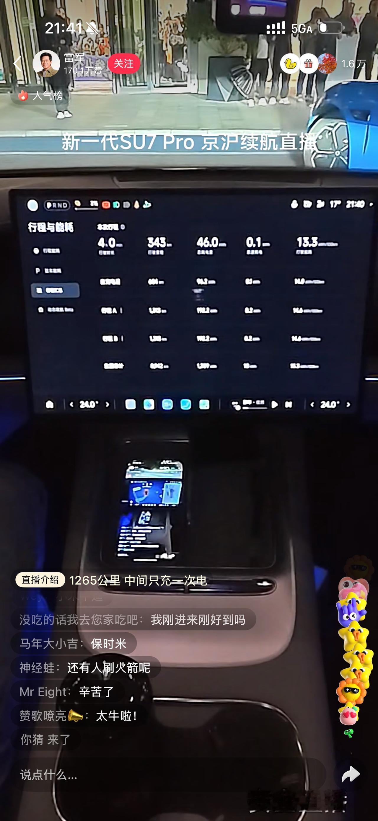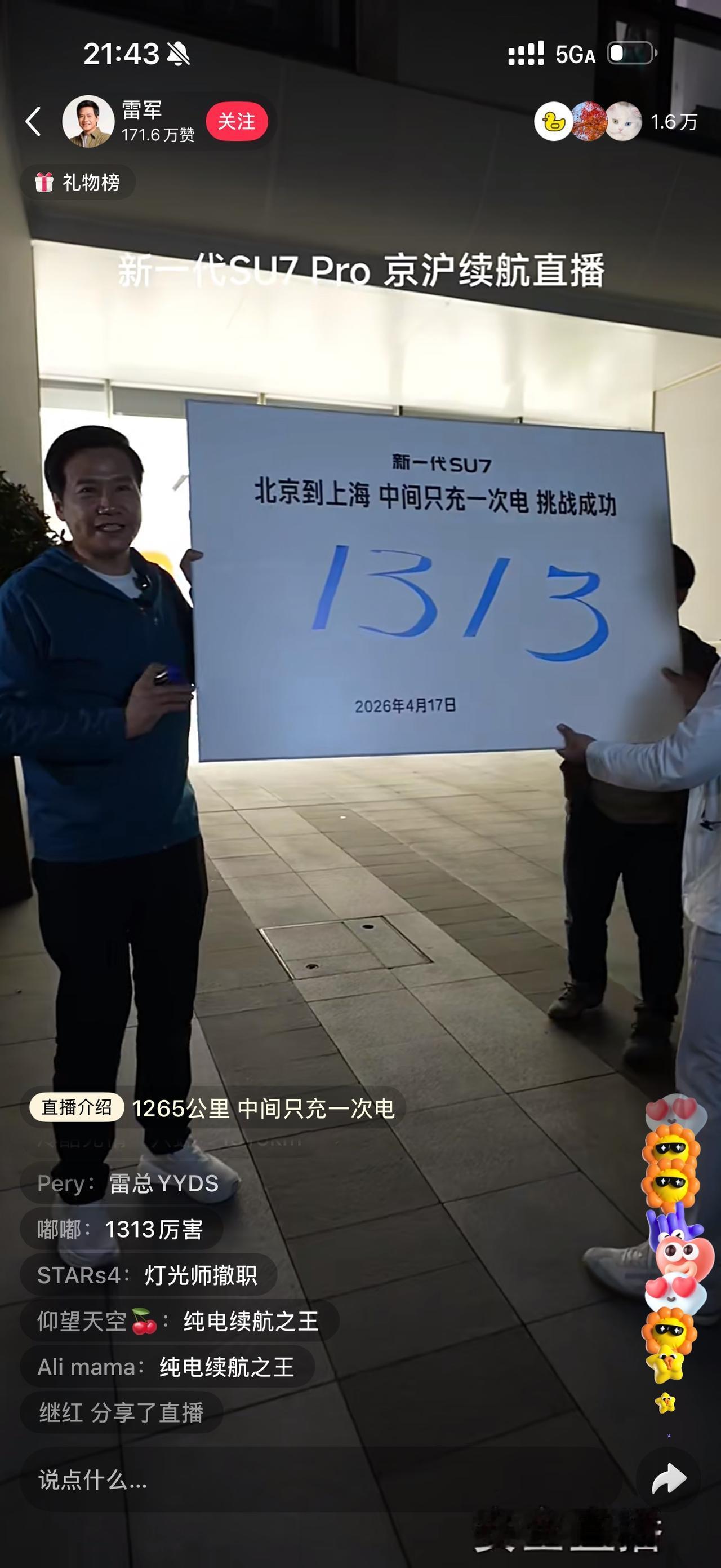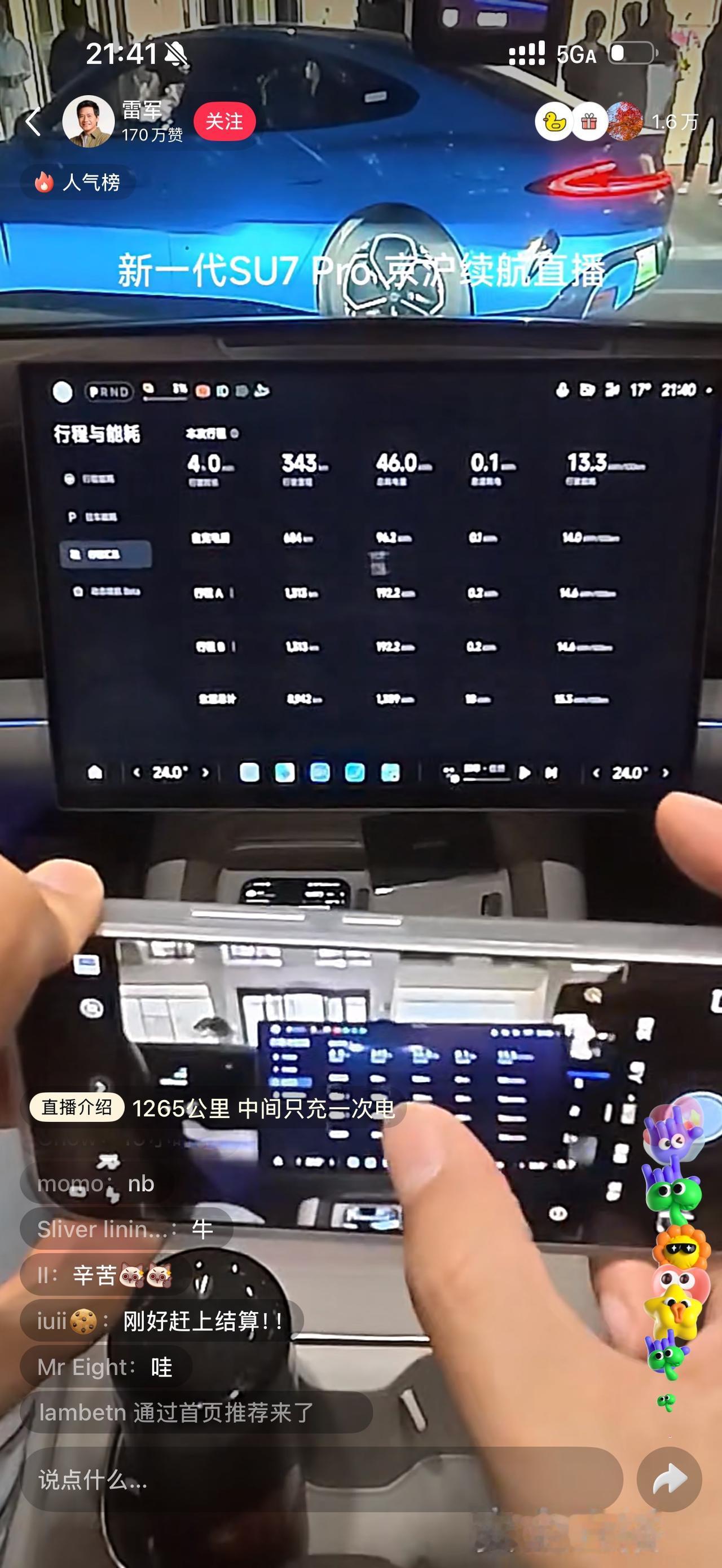 雷总直播挑战成功了[灵光一闪]新小米SU7北京到上海中间只充一次电,实际跑了13