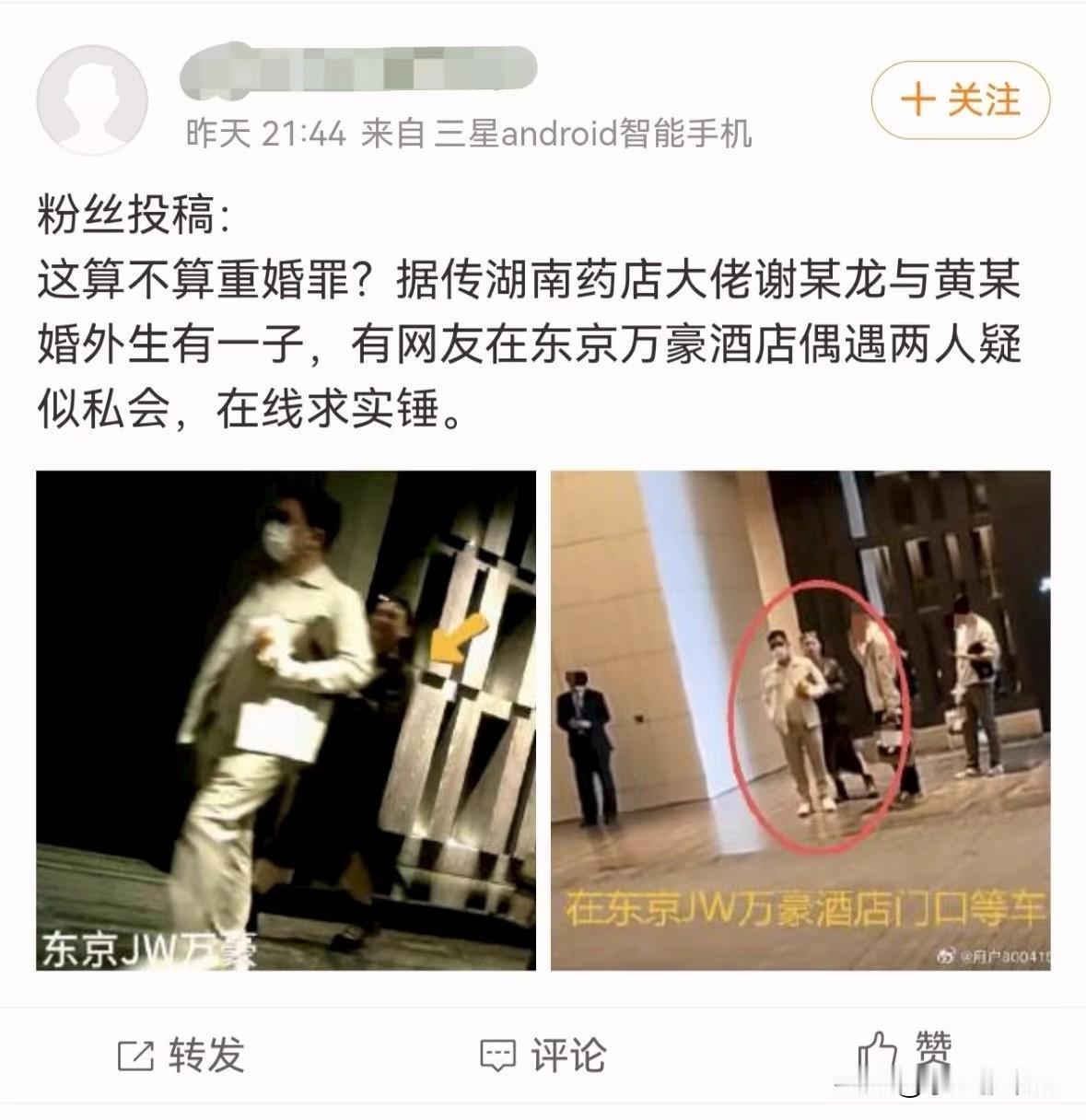 近日,网上传来一个消息,老百姓大药房连锁股份有限公司创始人、董事长谢子龙婚内出轨,并和情人婚外生子被实锤。有网友爆料晒图在日本东京偶遇谢子龙与情人黄某同游,举止亲密暧昧。